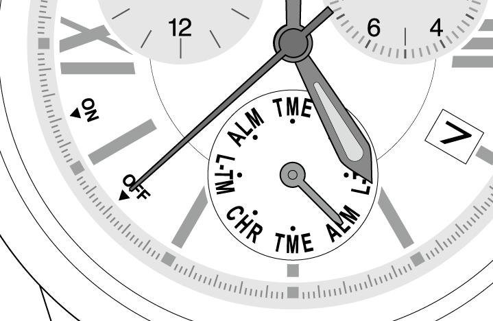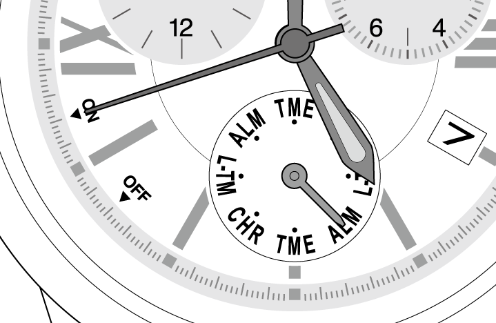 秒針は、現在のアラームのオン・オフ((ALARM) ON・(ALARM) OFF)設定を指します。