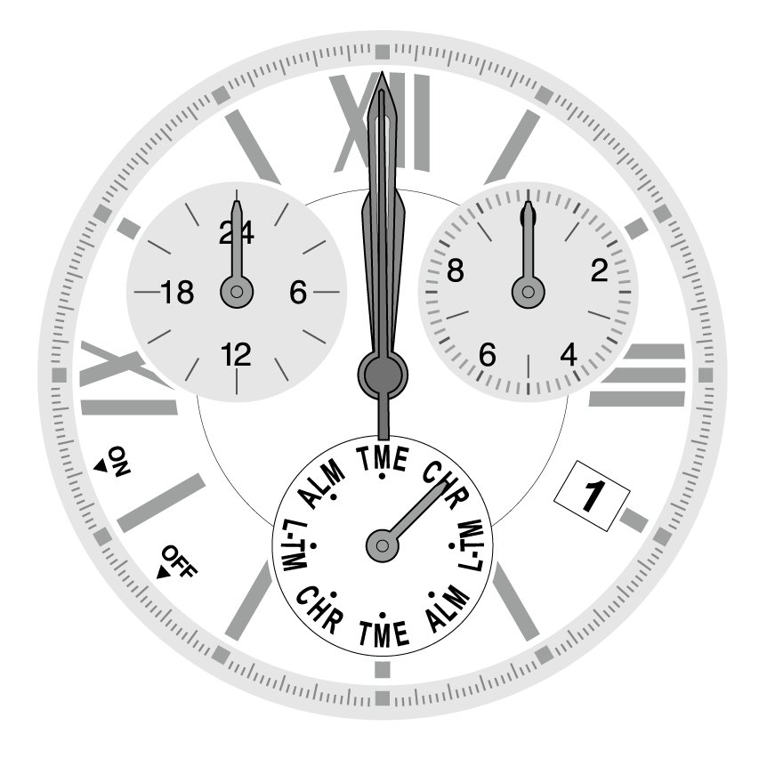 - りゅうずを回して、時針、分針、24時間針を正しい基準位置に合わせる