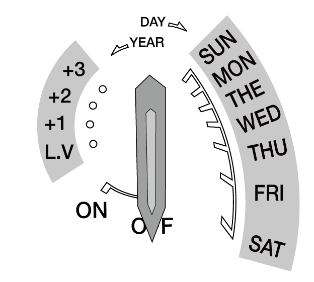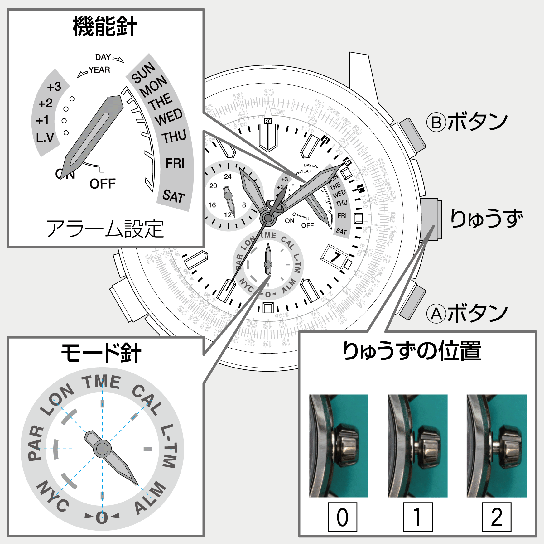 機能針がアラーム設定(ON/OFF)を指し、時針・分針・24時間針がアラーム設定時刻を表示します。
