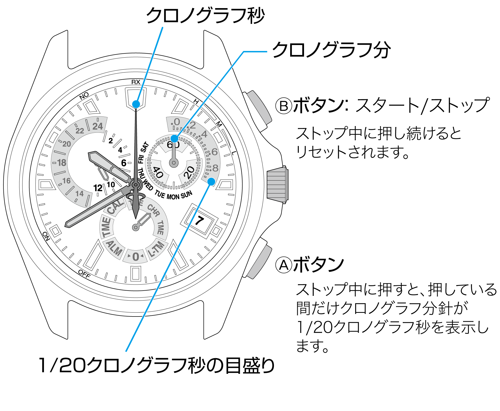 りゅうずの位置を変更すると、クロノグラフはリセットされます。