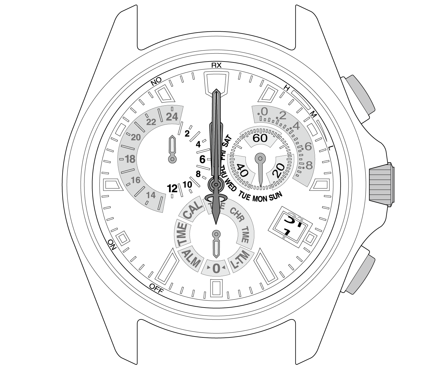 りゅうずを回してモード針を「TME」に合わせ、りゅうずの位置を0にして終了します。 |
