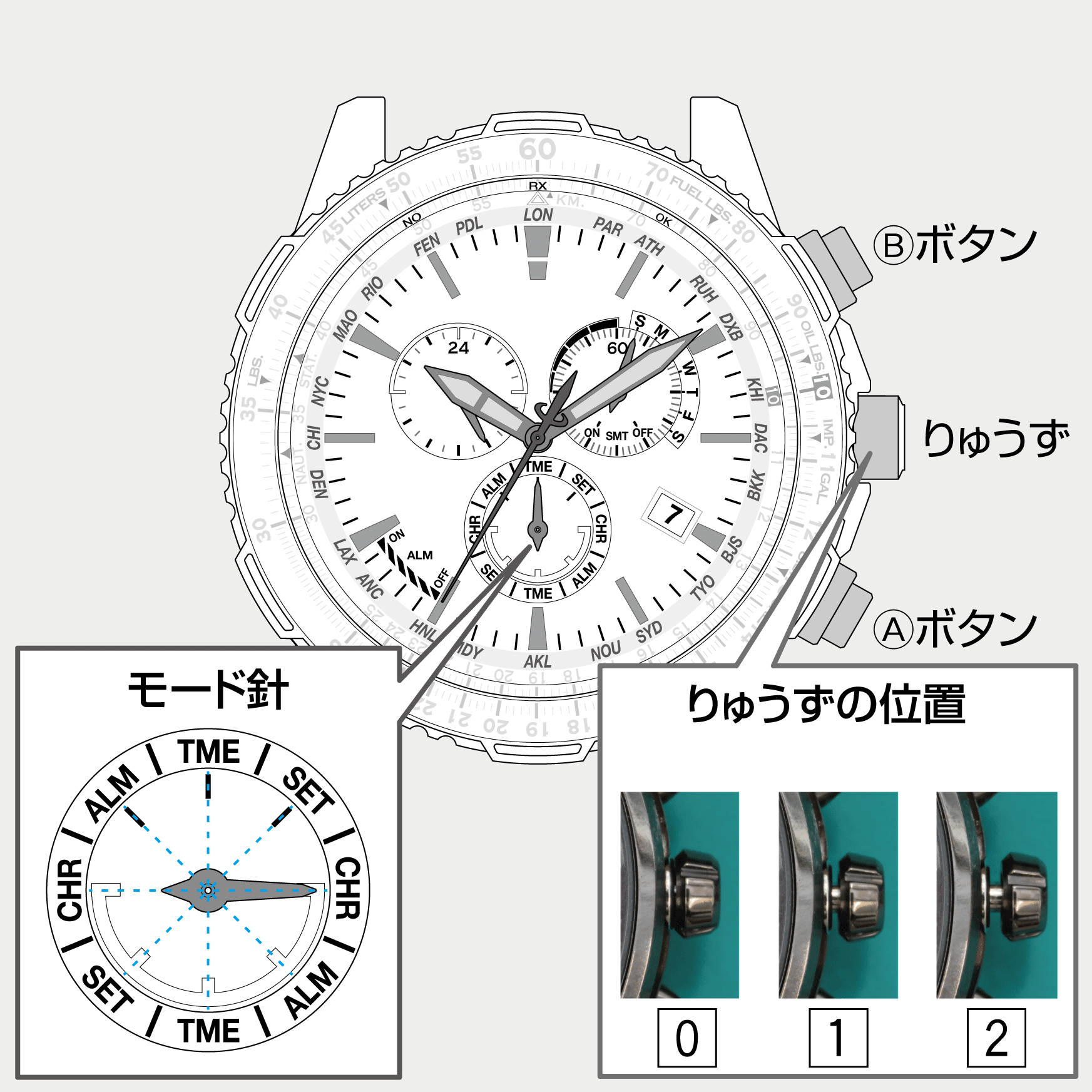 機能針・日表示 → 時針・分針・24時間針 → 秒針 → (はじめに戻る)