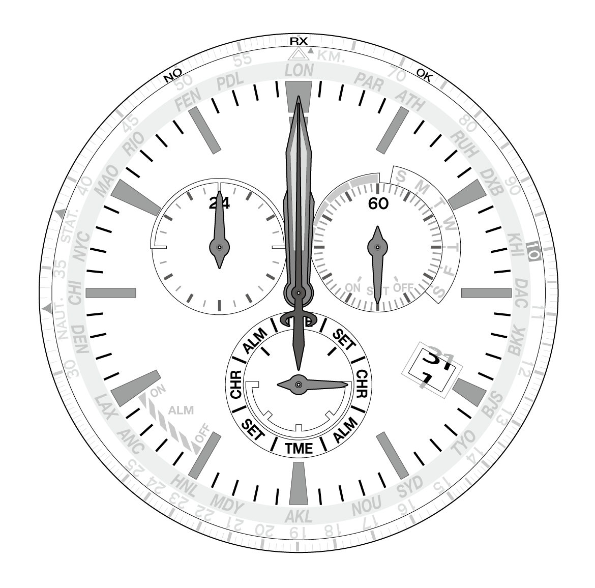 - 各表示が正しい基準位置からずれていると、時刻情報を受信しても、時刻・カレンダーが正しく表示されません。