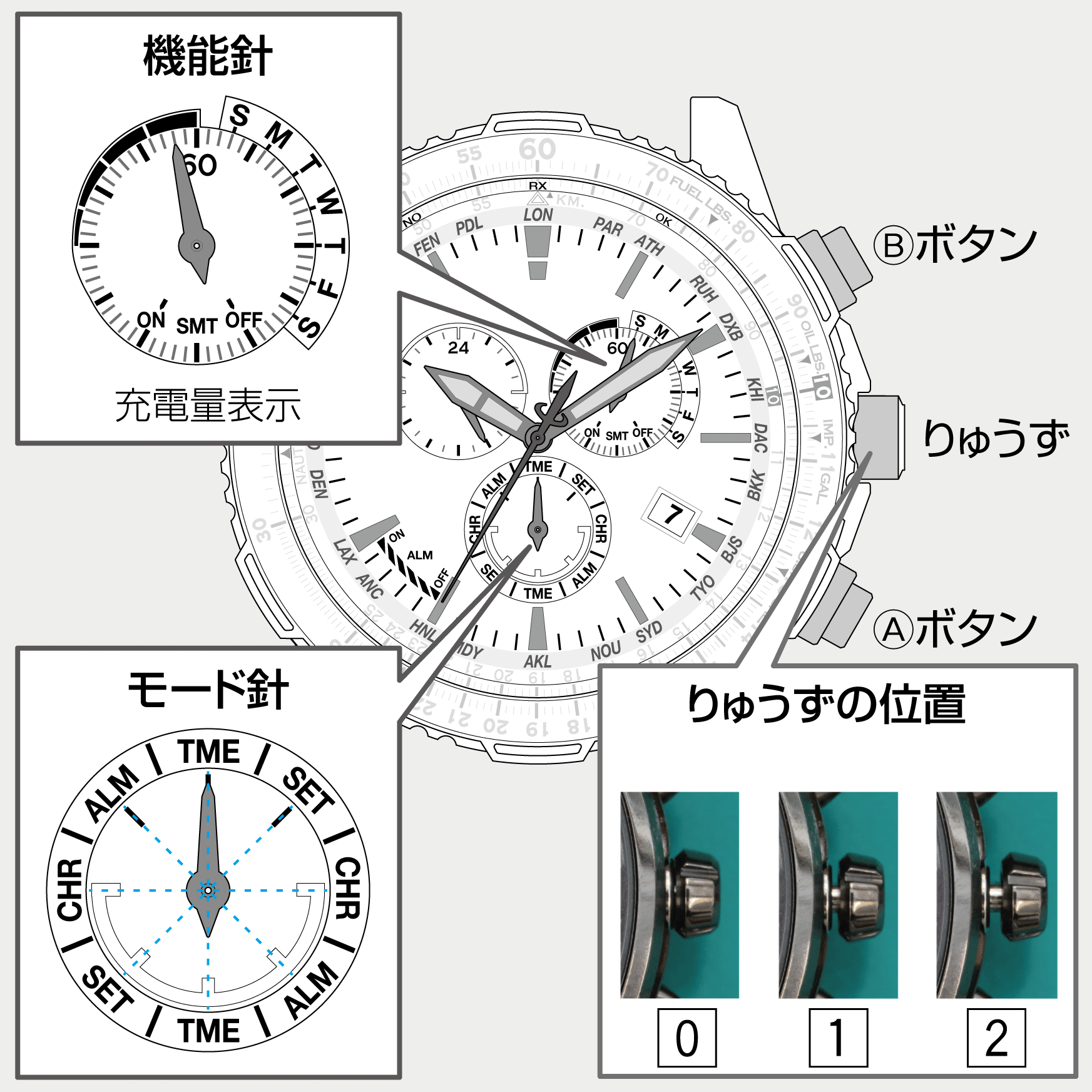機能針が充電量をレベル表示し、秒針が前回の受信結果を表示します。