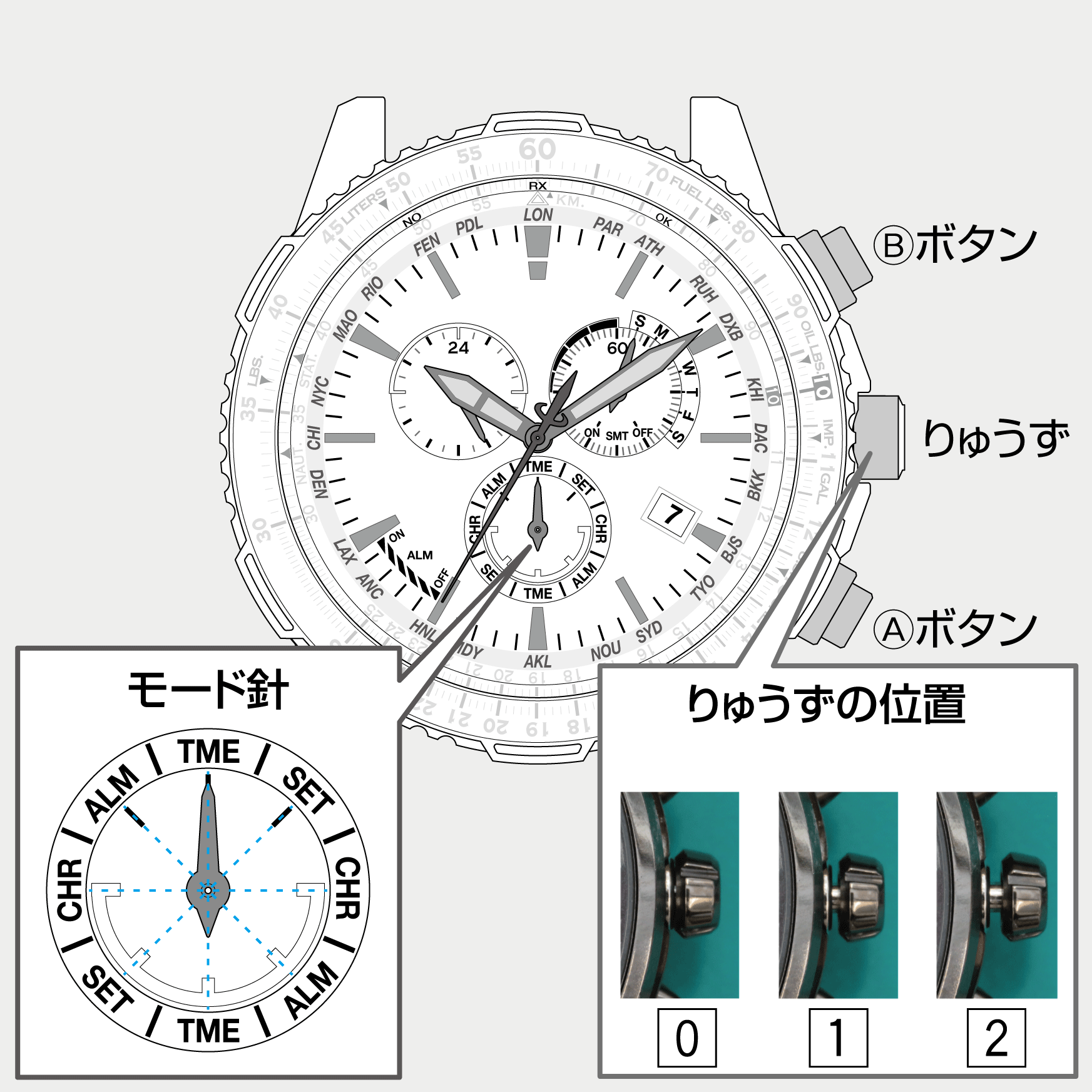 - 秒針が「RX」を指すまで、右下のAボタンを2秒間以上押し続ける