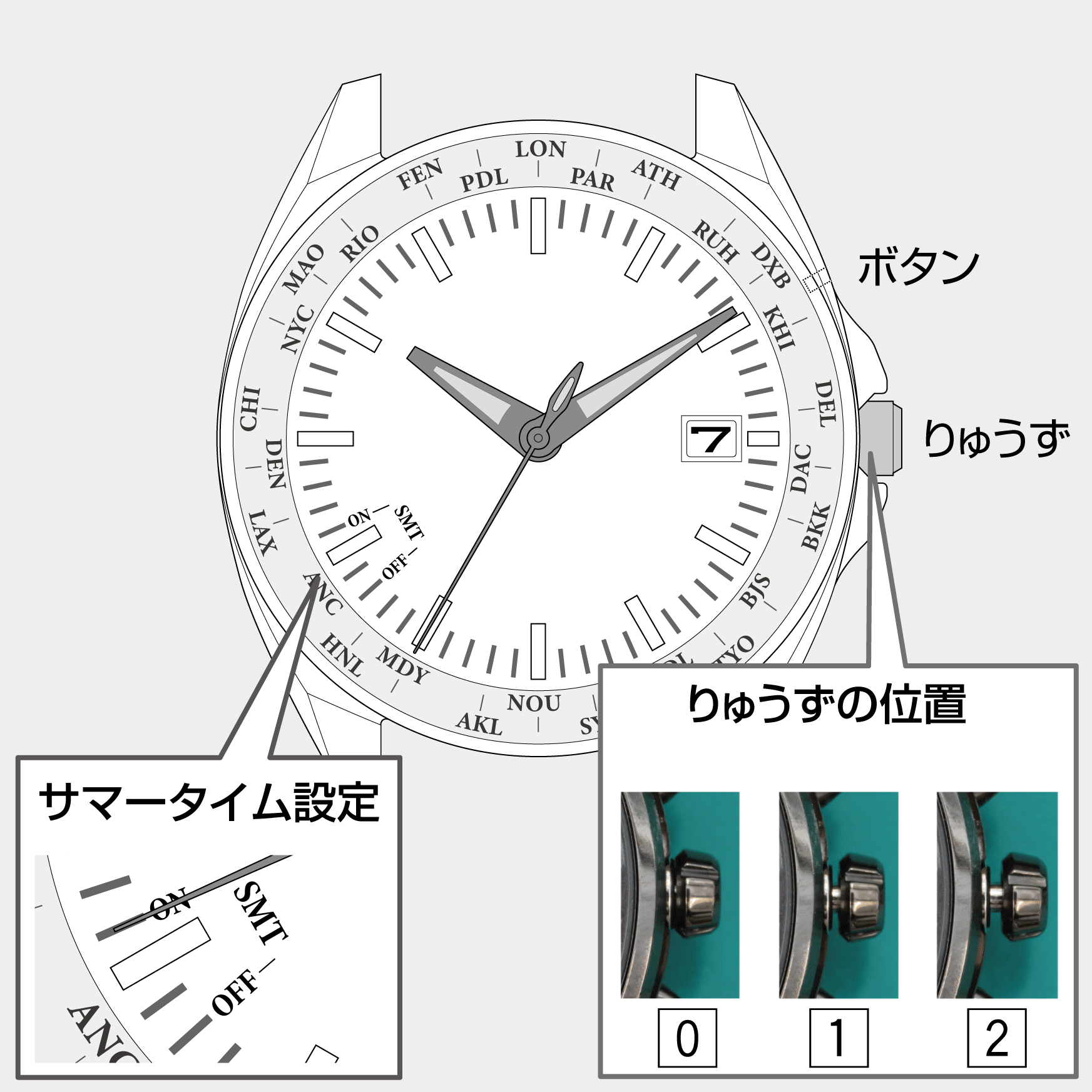 - りゅうずを右に回して、サマータイム設定(SMT ON/OFF)を切り替える