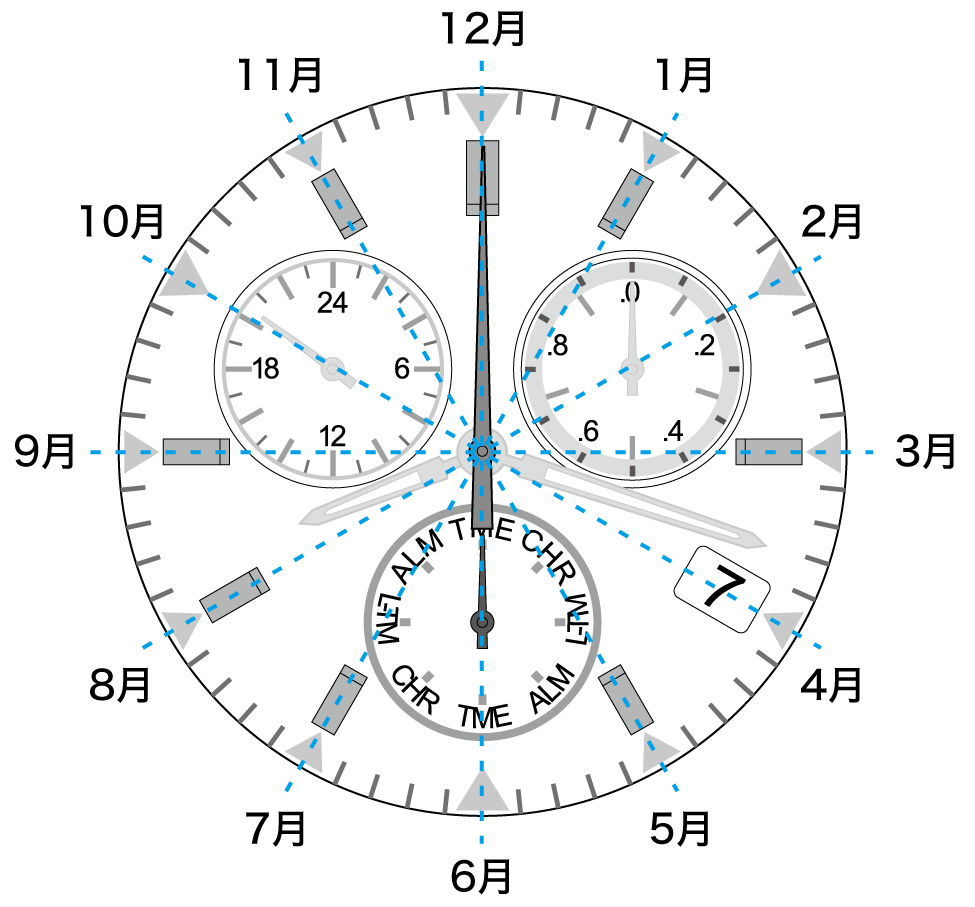 秒針が「月」を表示し、機能針が「年」を表示します。