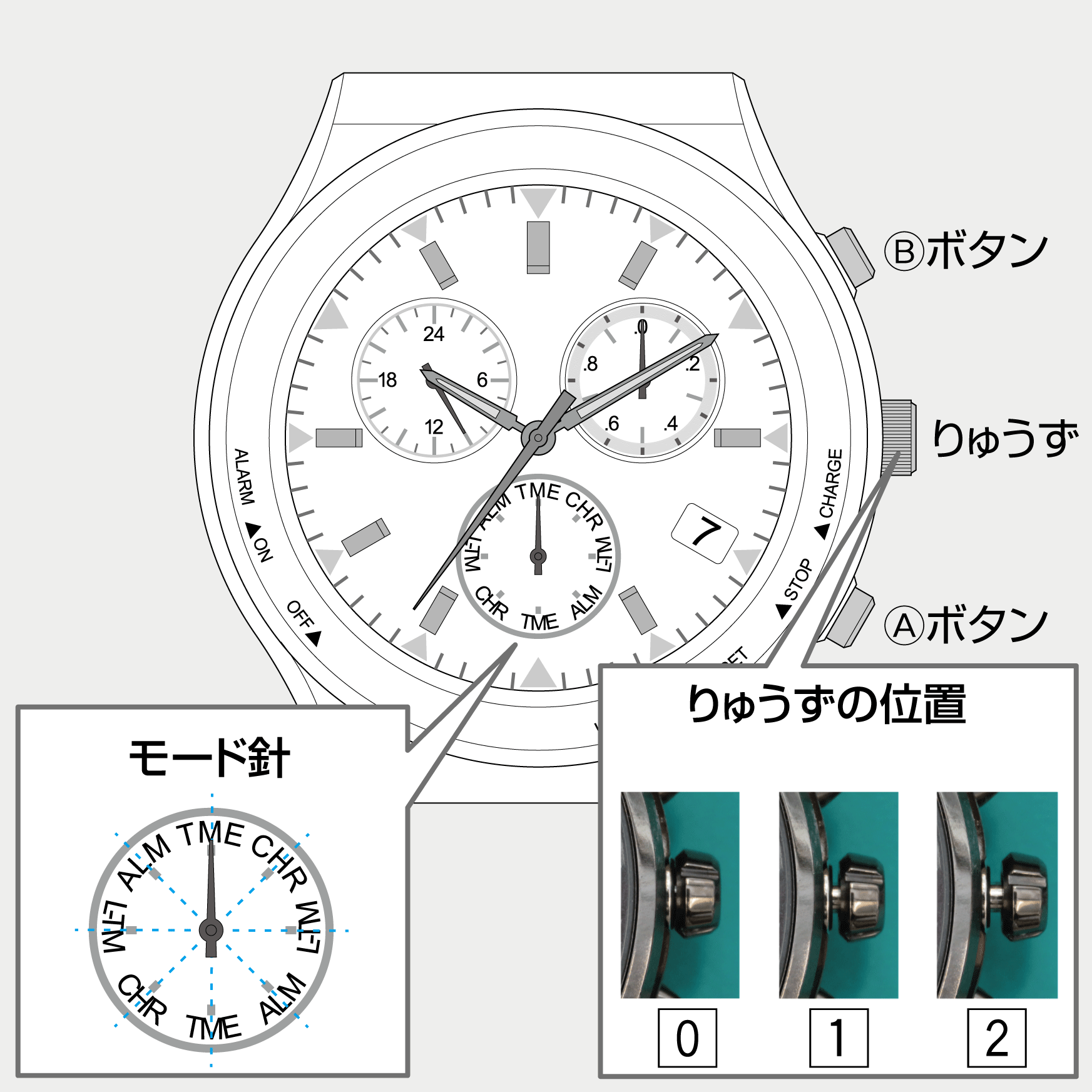 - りゅうずを回して、モード針を切り替えたいモードに合わせる