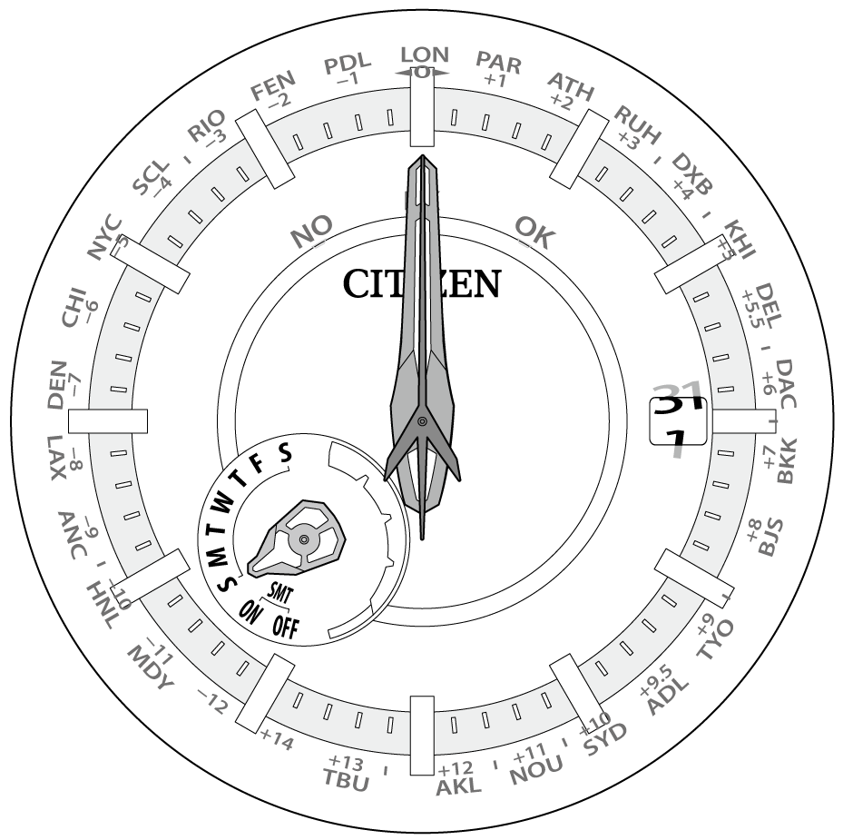 機能針・日表示 → 時針 → 分針 → 秒針 → (はじめに戻る)