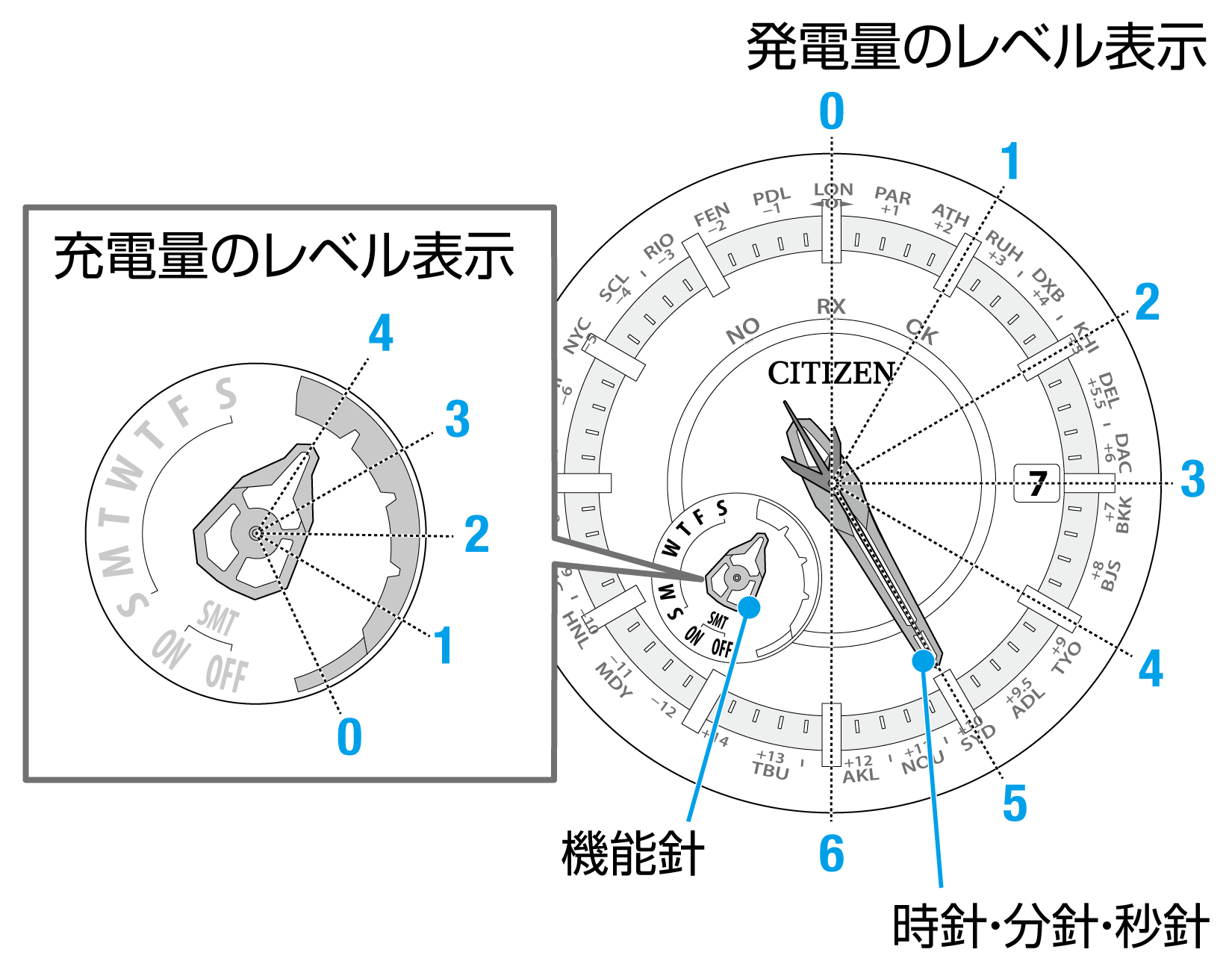 発電量のレベル表示は、秒針の尾部または先端で表示され、モデルによって異なります。