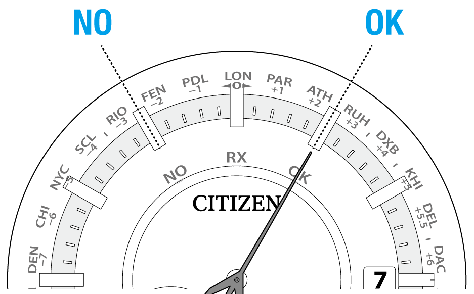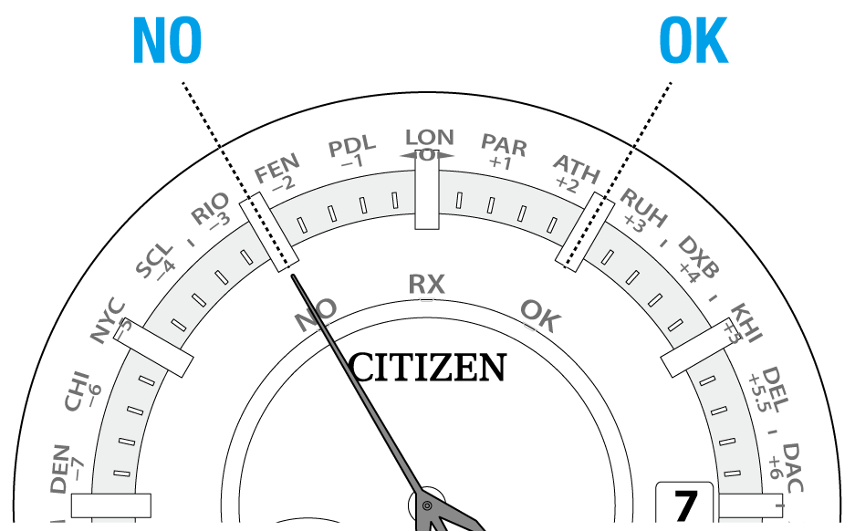 モデルによって、受信中表示(RX)と受信結果(OK/NO)が秒針の尾部で表示されます。