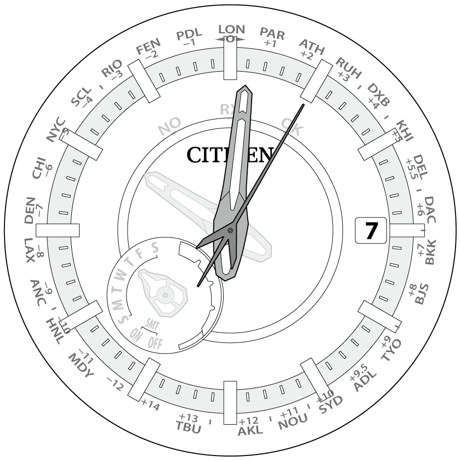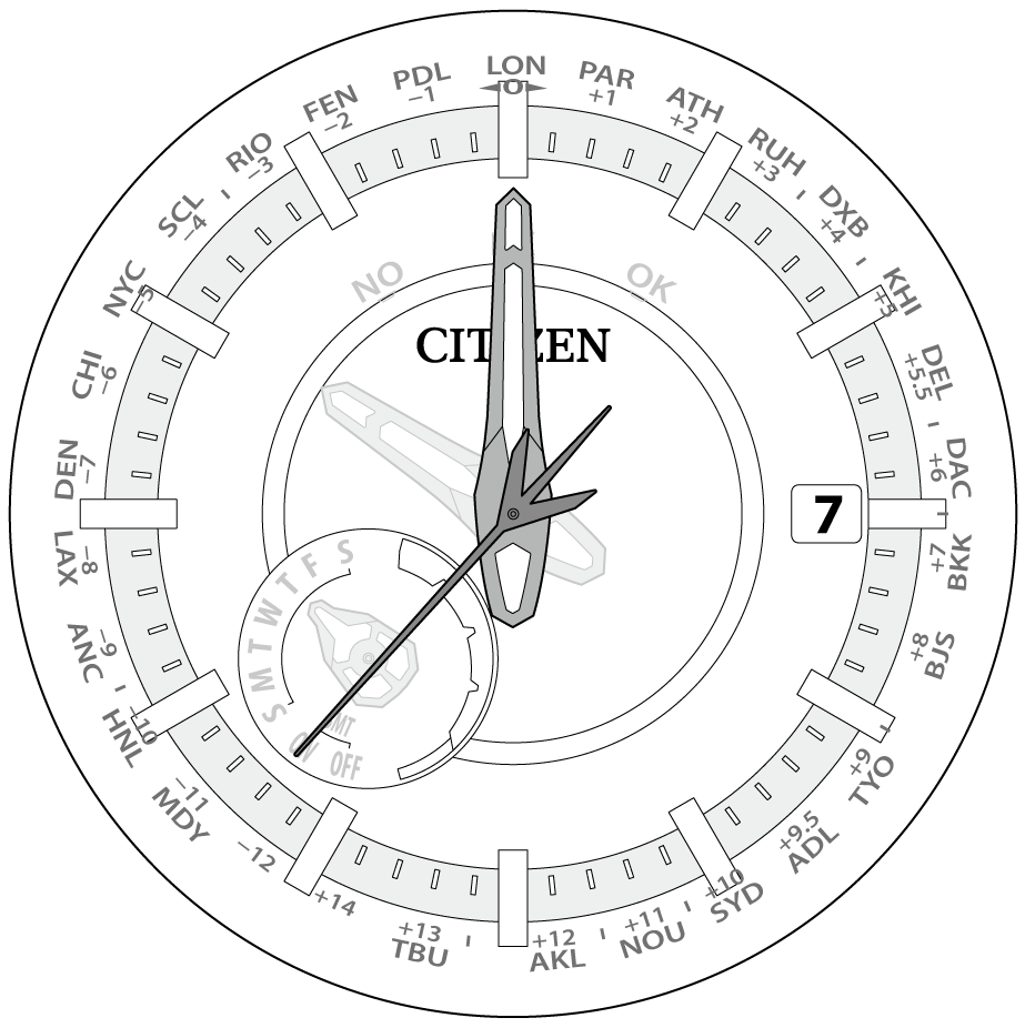 - うるう秒の設定が正しくないときは、りゅうずを回して設定を修正する