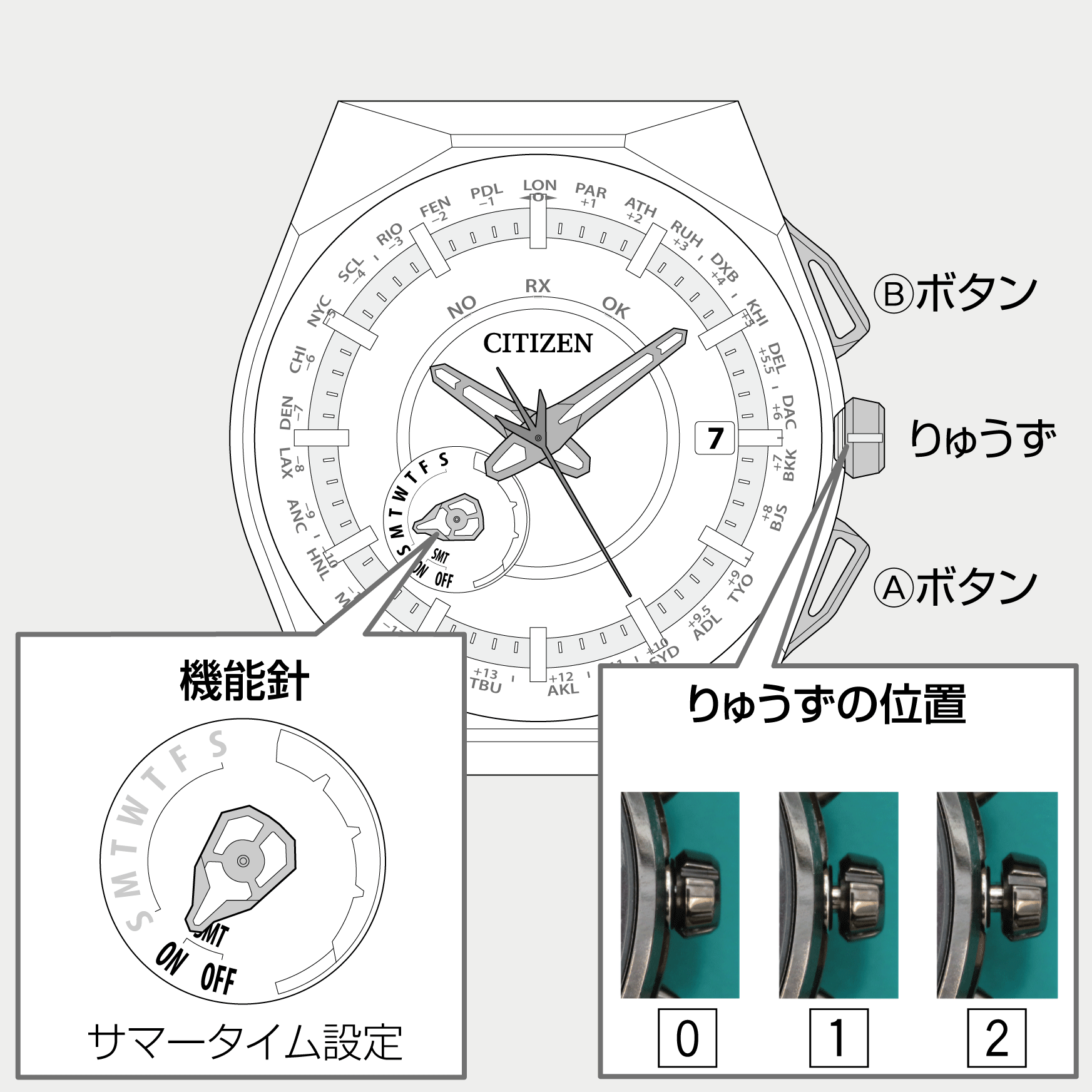 秒針が現在のワールドタイム設定を指し、機能針がサマータイム設定を指します。