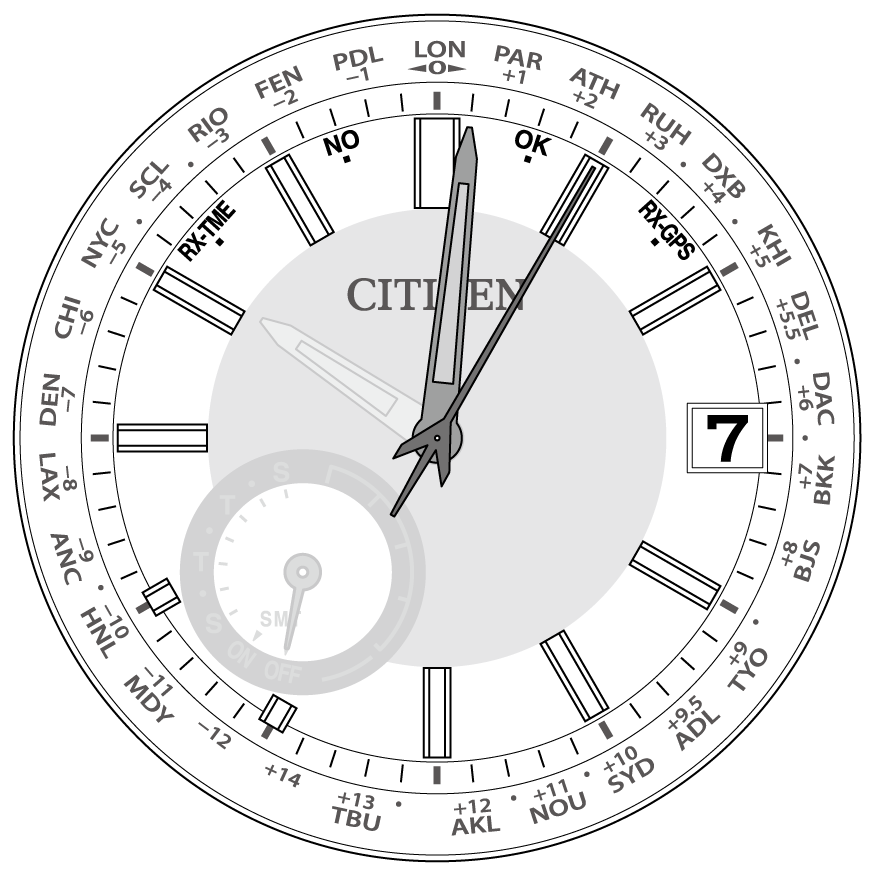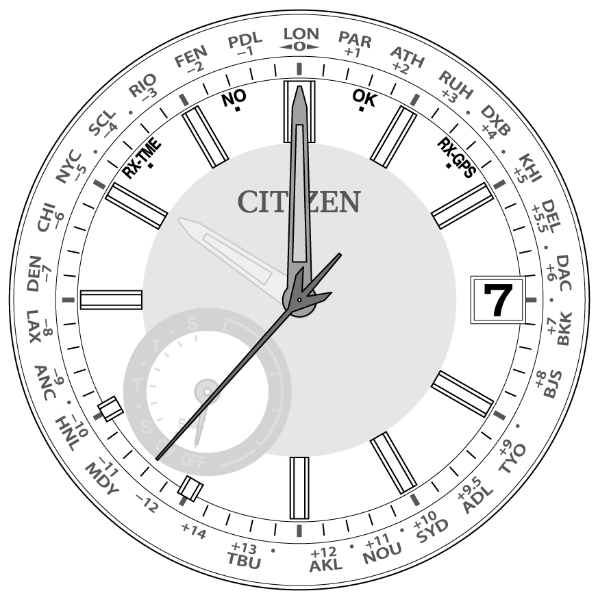 - うるう秒の設定が正しくないときは、りゅうずを回して設定を修正する