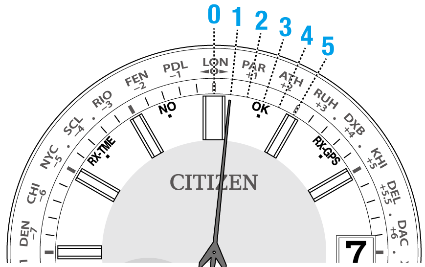 秒針と分針が「0分0秒」を起点とした経過秒数で、うるう秒の設定を表示します。