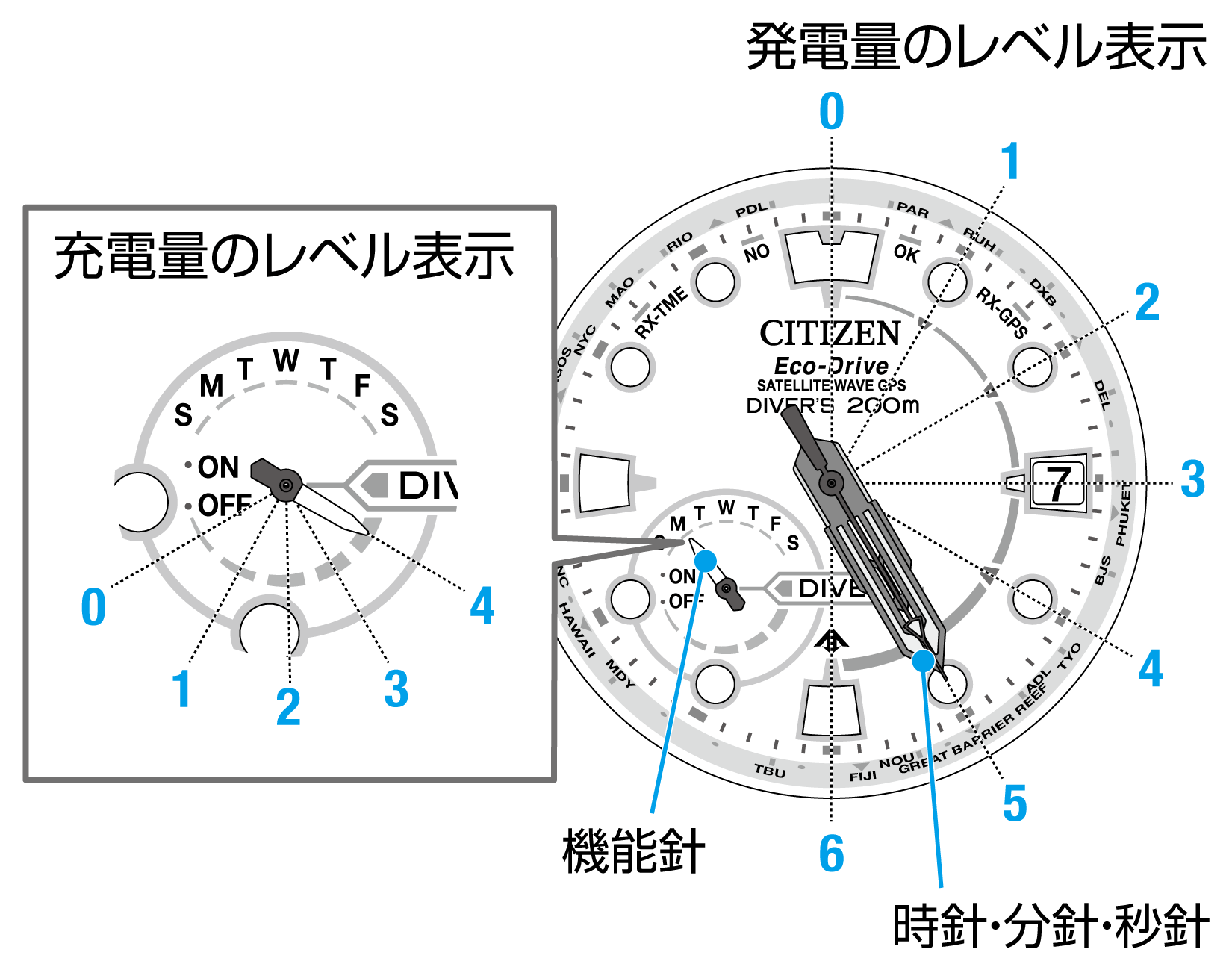 発電量のレベル表示は、秒針の尾部または先端で表示され、モデルによって異なります。