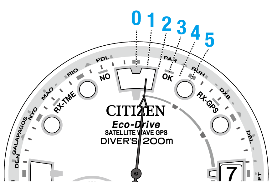 秒針と分針が「0分0秒」を起点とした経過秒数で、うるう秒の設定を表示します。