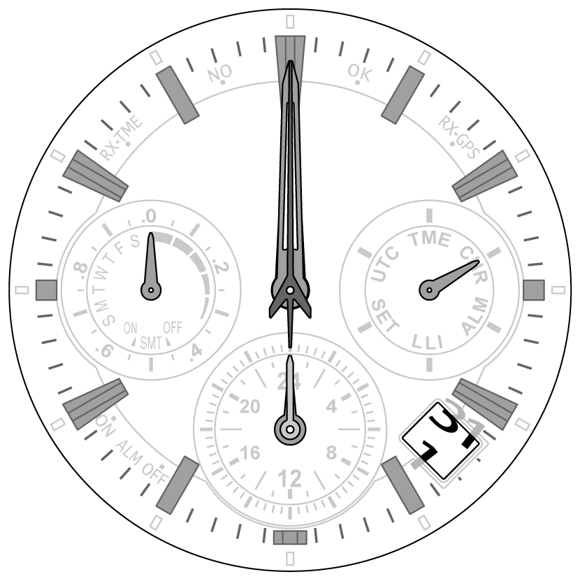 - 各表示が正しい基準位置からずれていると、時刻情報を受信しても、時刻・カレンダーが正しく表示されません。