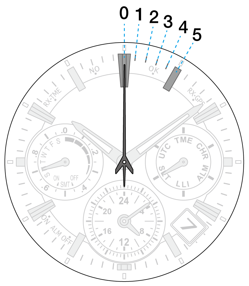 秒針と分針が「0分0秒」を起点とした経過秒数で、うるう秒の設定を表示します。