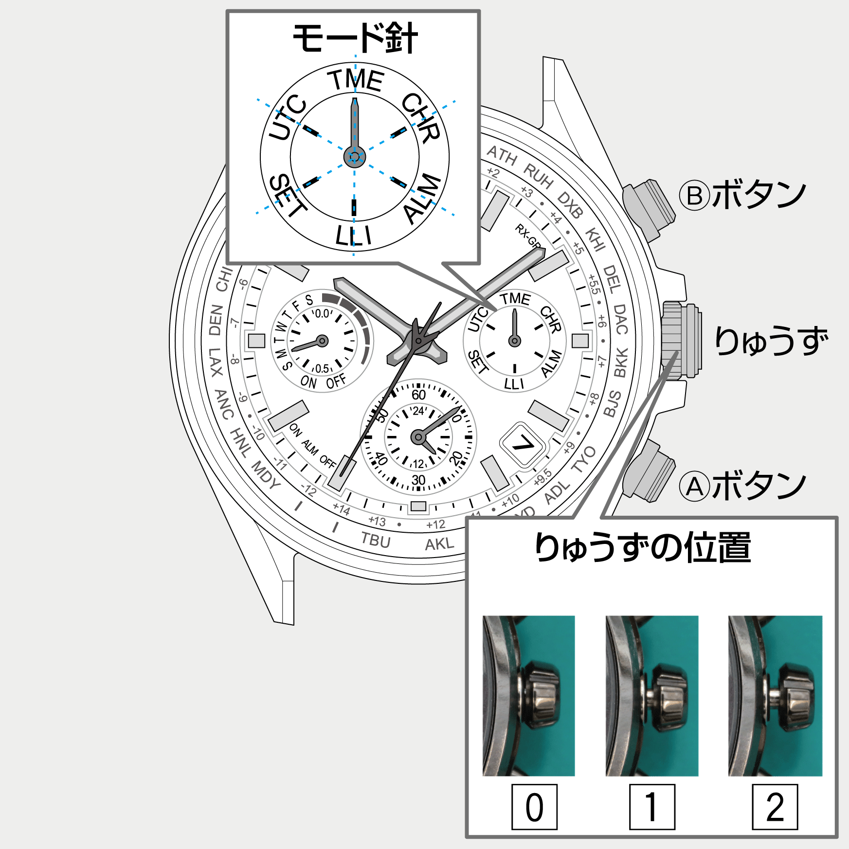 - りゅうずを回して、モードを[TME]または[LLI]に切り替える