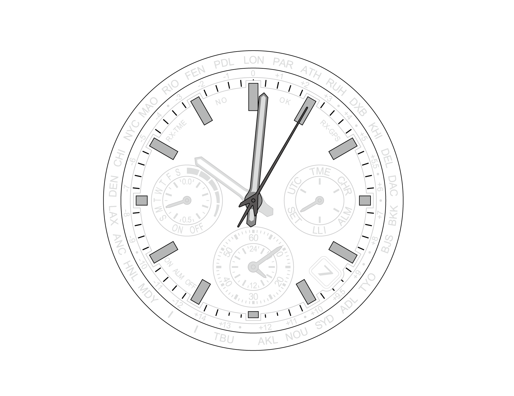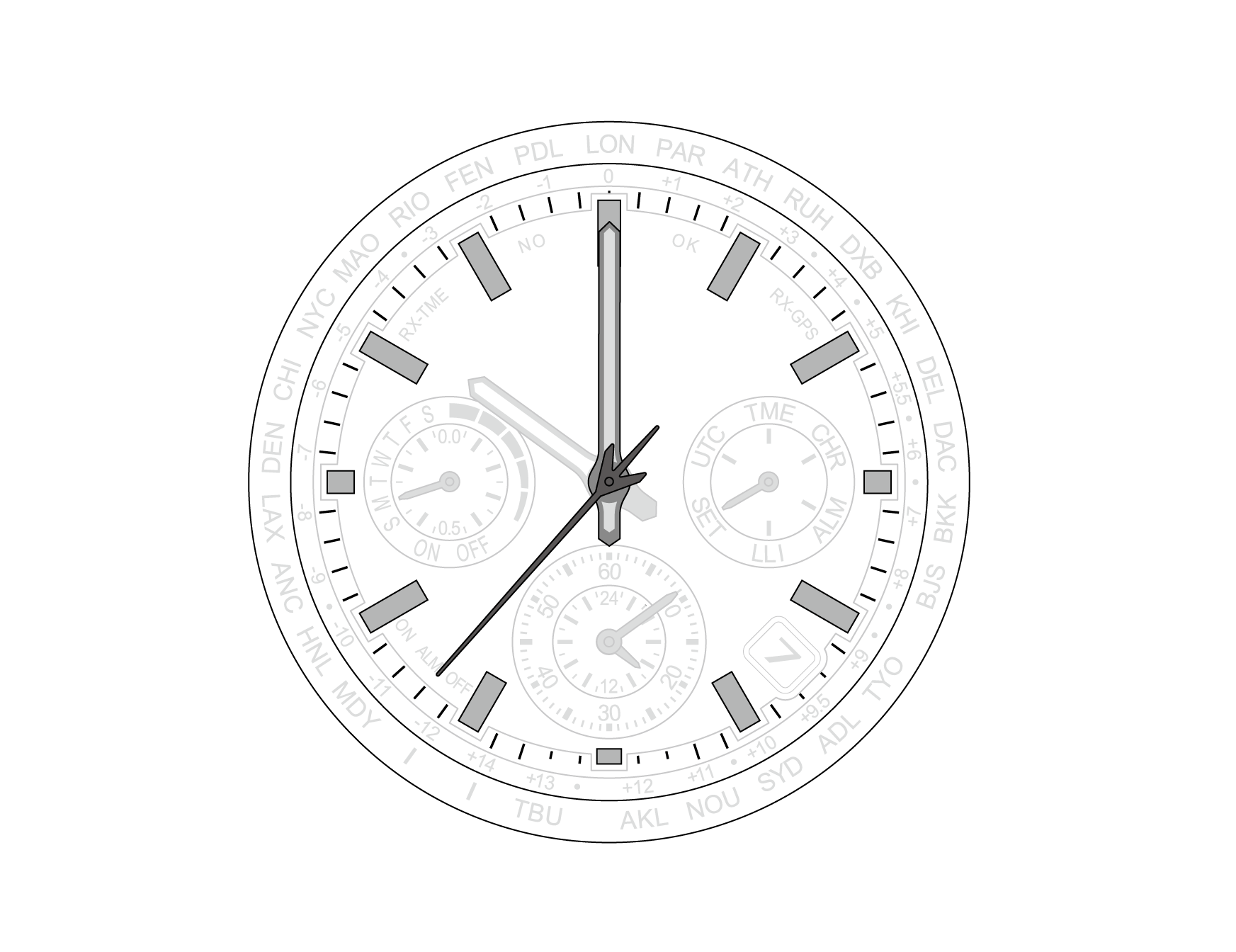 秒針と分針が「0分0秒」を起点とした経過秒数で、うるう秒の設定を表示します。