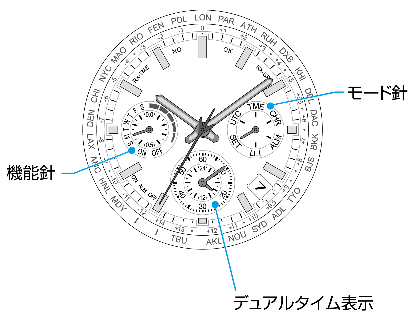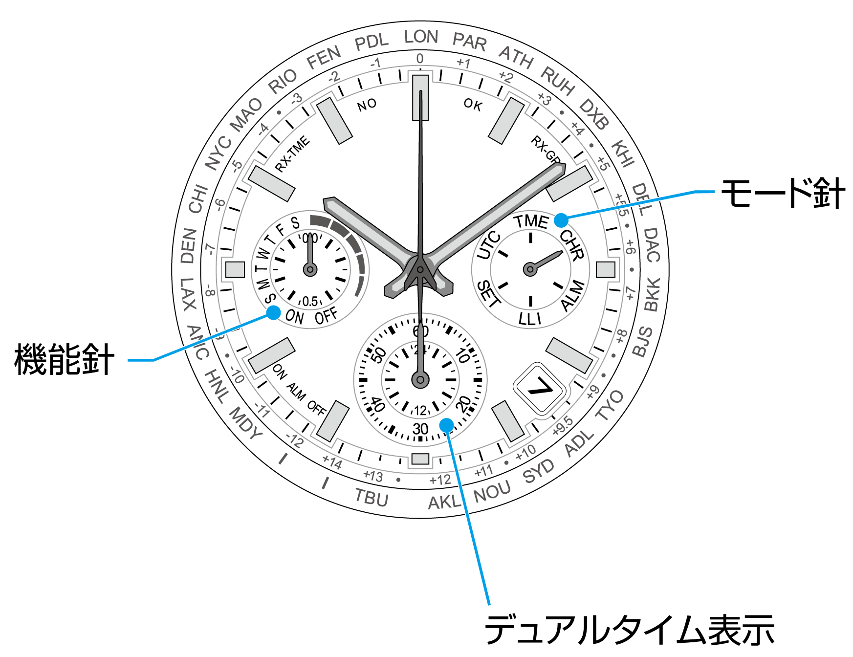 | デュアルタイム表示 | ローカルタイムの時刻を表示します。 | |