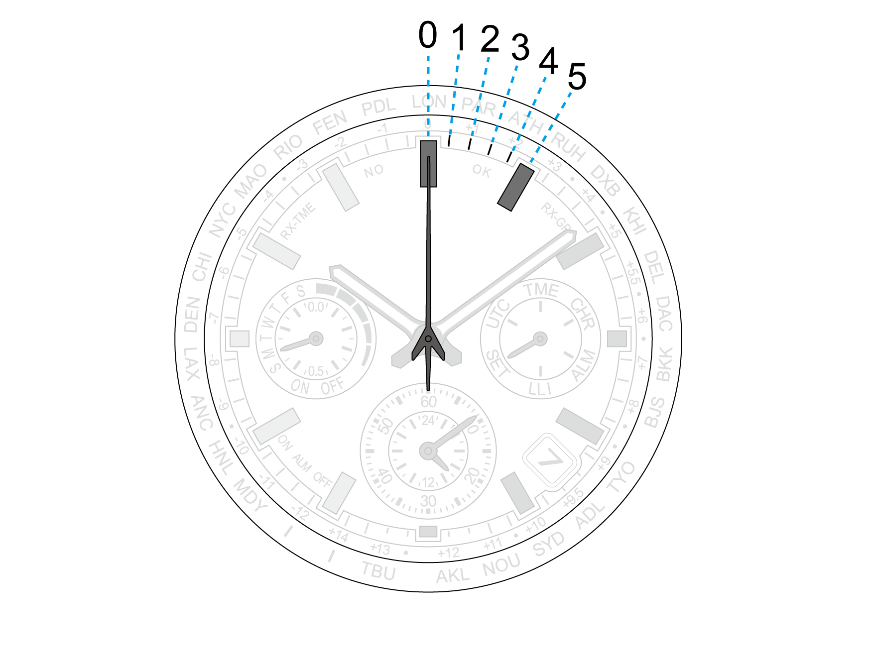 秒針と分針が「0分0秒」を起点とした経過秒数で、うるう秒の設定を表示します。