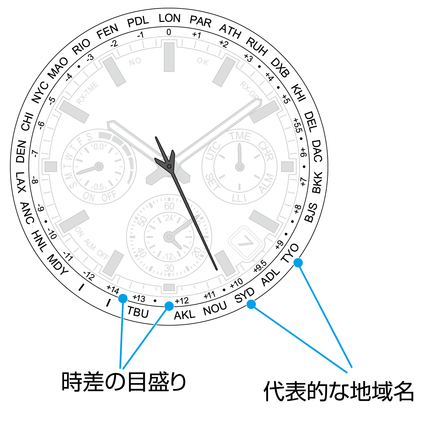 時計上には、時差の目盛りが39あり、一部にはその時差に含まれる代表的な地域名の表記もあります。