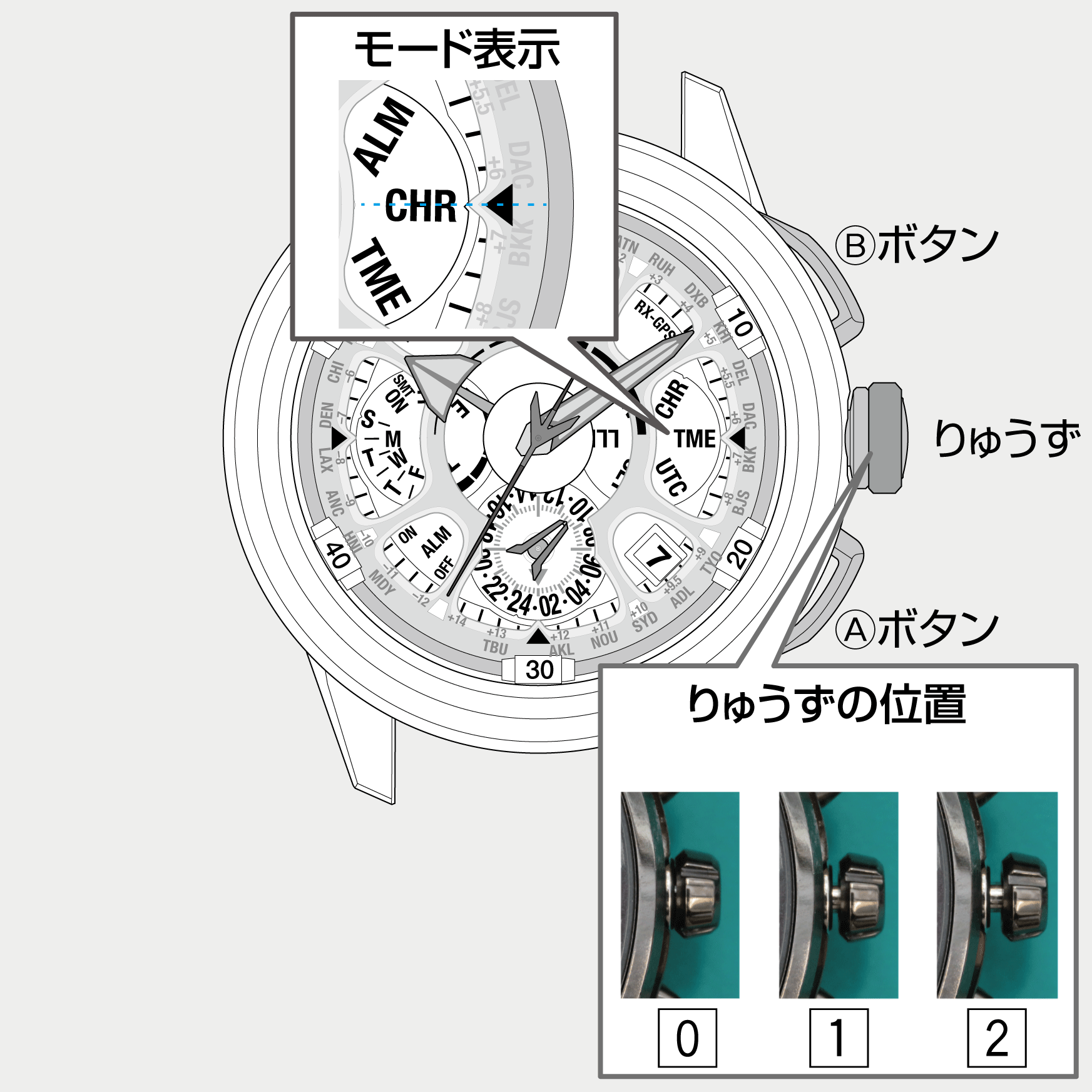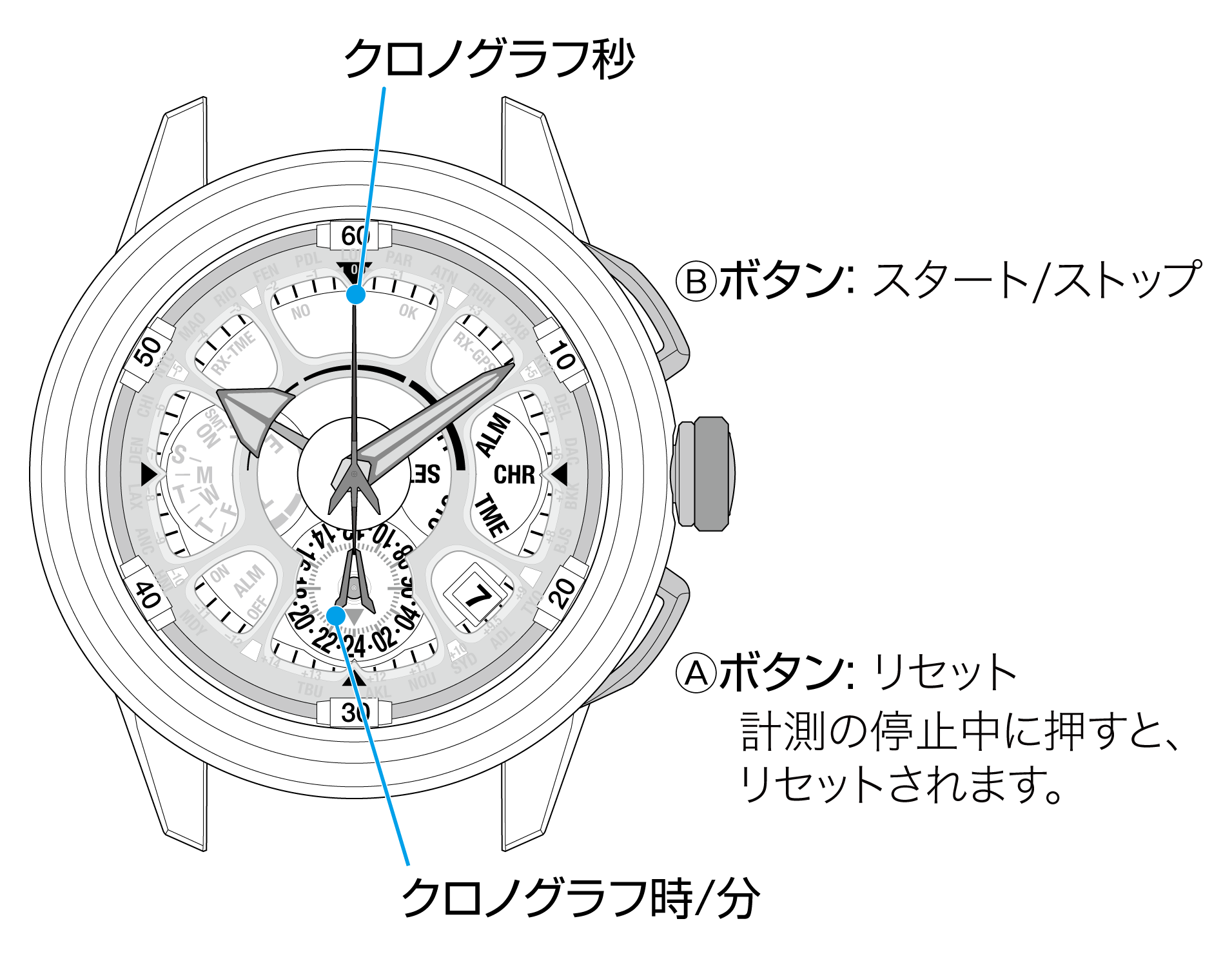 りゅうずの位置を変更すると、クロノグラフはリセットされます。