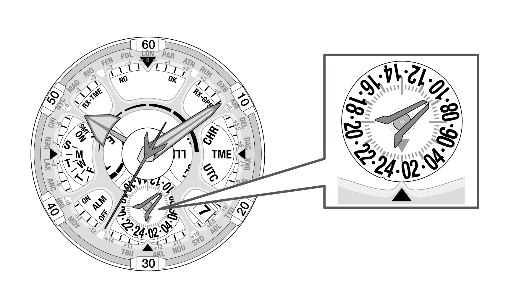 - 「時」は、外側の数字と読み位置(▲)で表示されます。