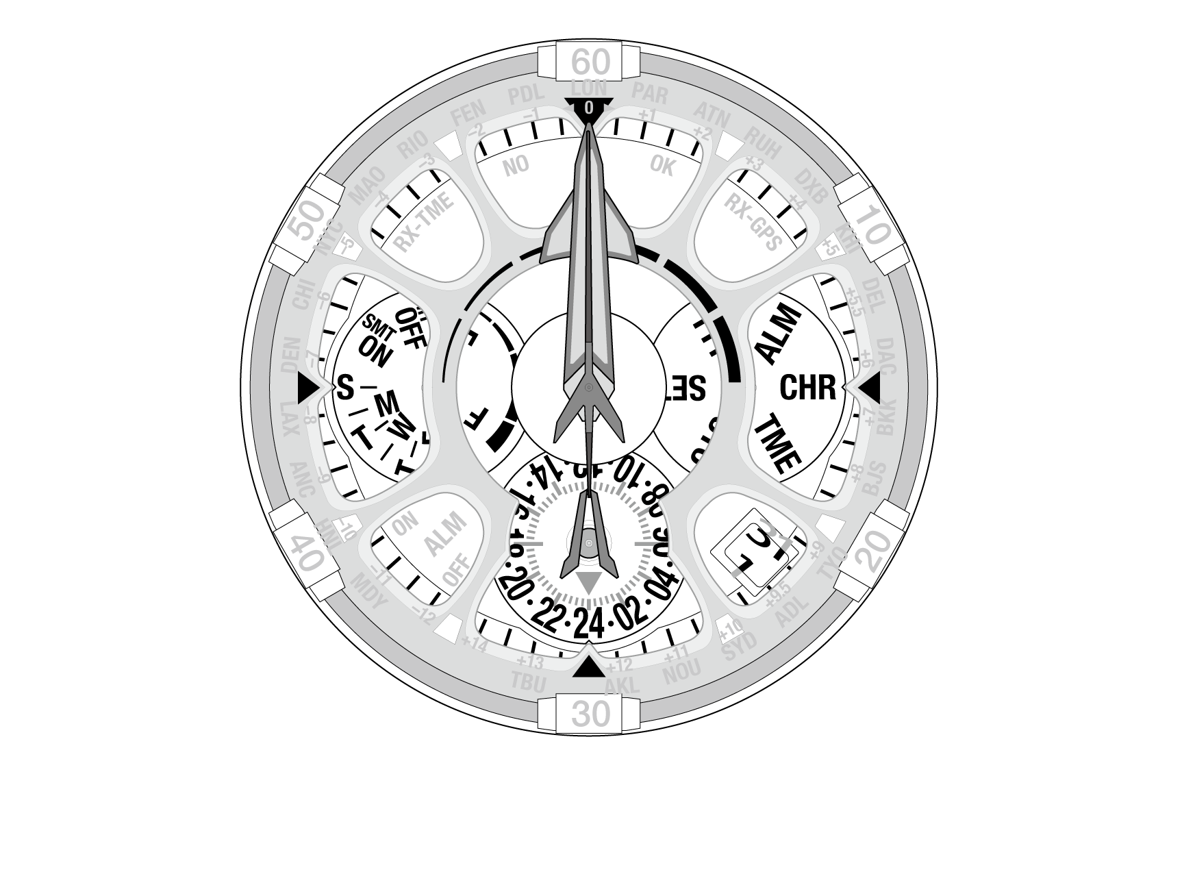 - 各表示が正しい基準位置からずれていると、時刻情報を受信しても、時刻・カレンダーが正しく表示されません。