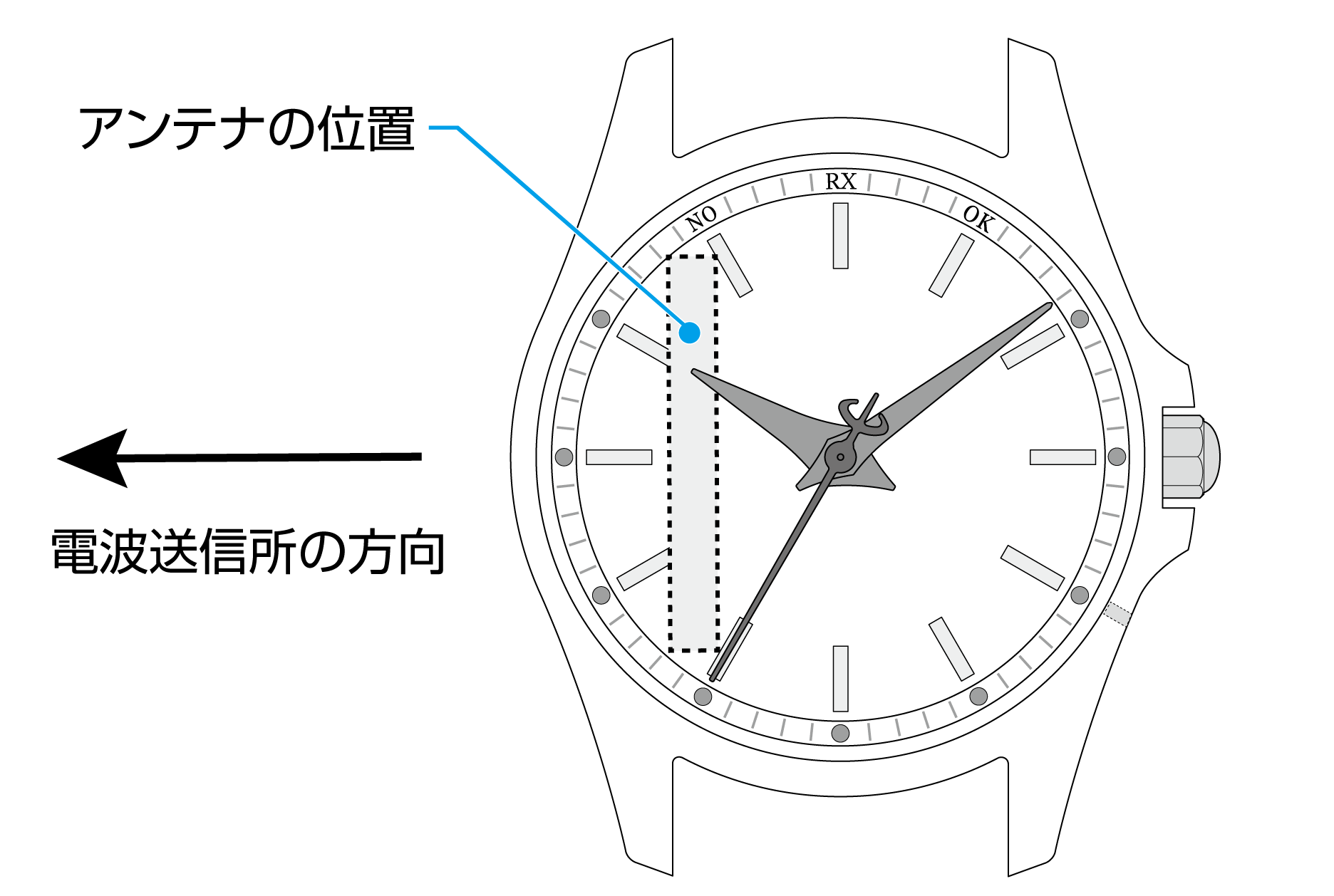 - 電波受信用のアンテナは、この時計の9時位置に組み込まれています。