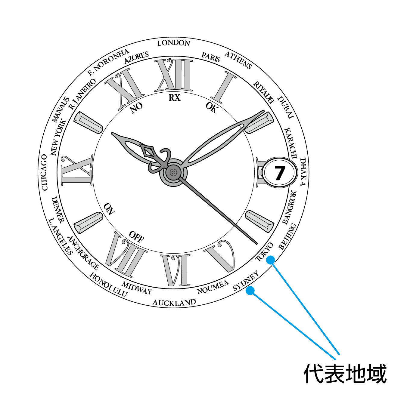 図では、秒針が「TOKYO(東京)」(22秒)を指しています。