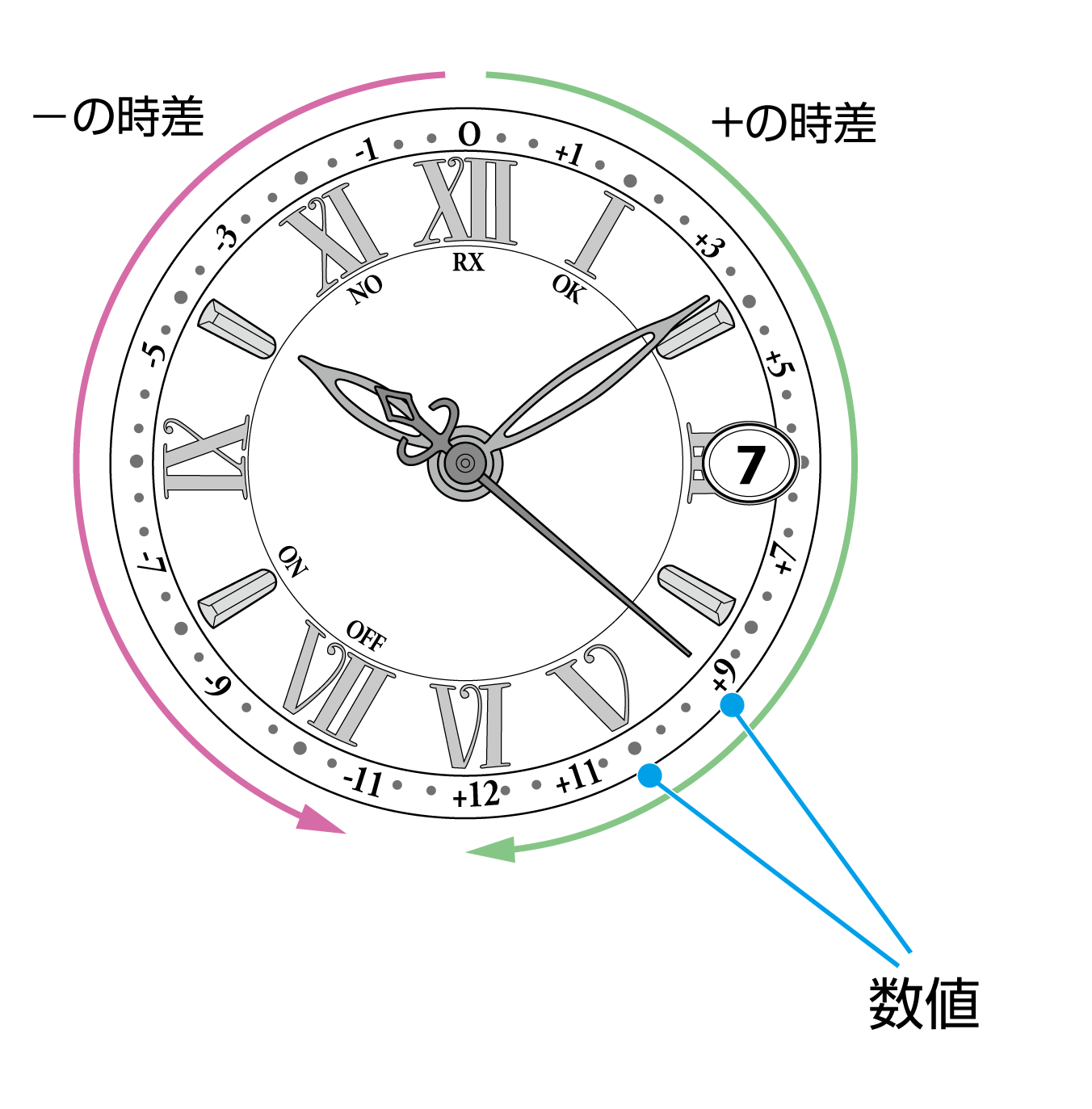 時計上には、24の時差が代表地域名または数値で表記されています。