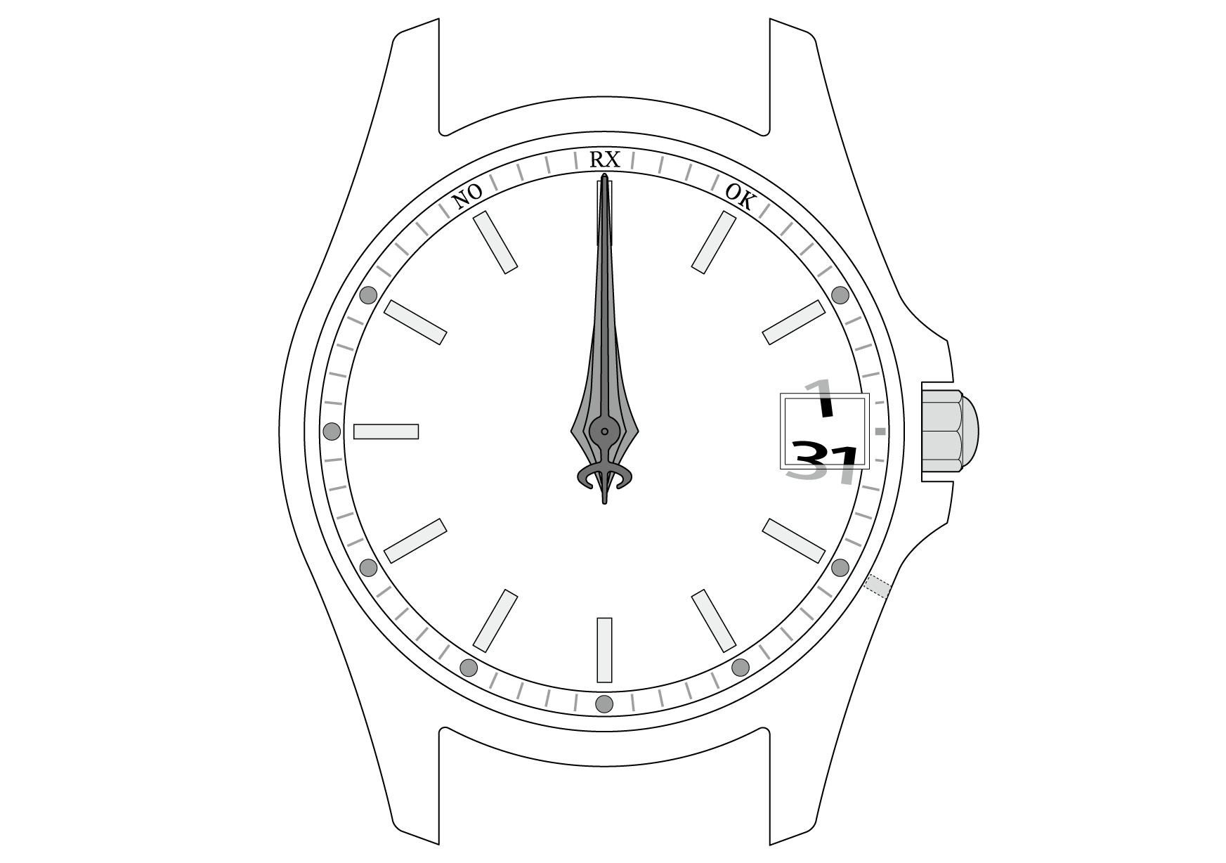 - りゅうずを回して、時針と日表示を正しい基準位置に合わせる