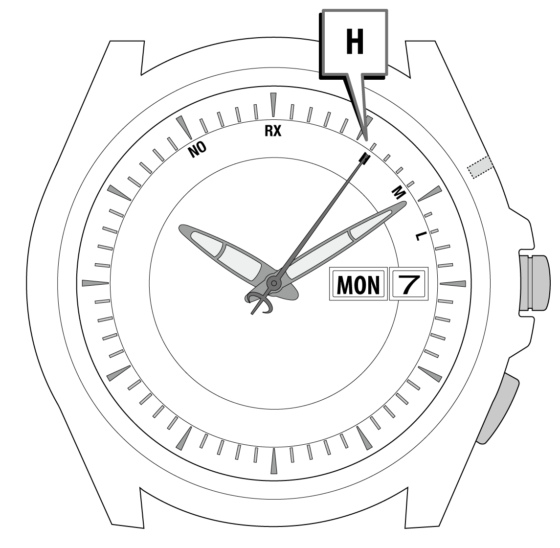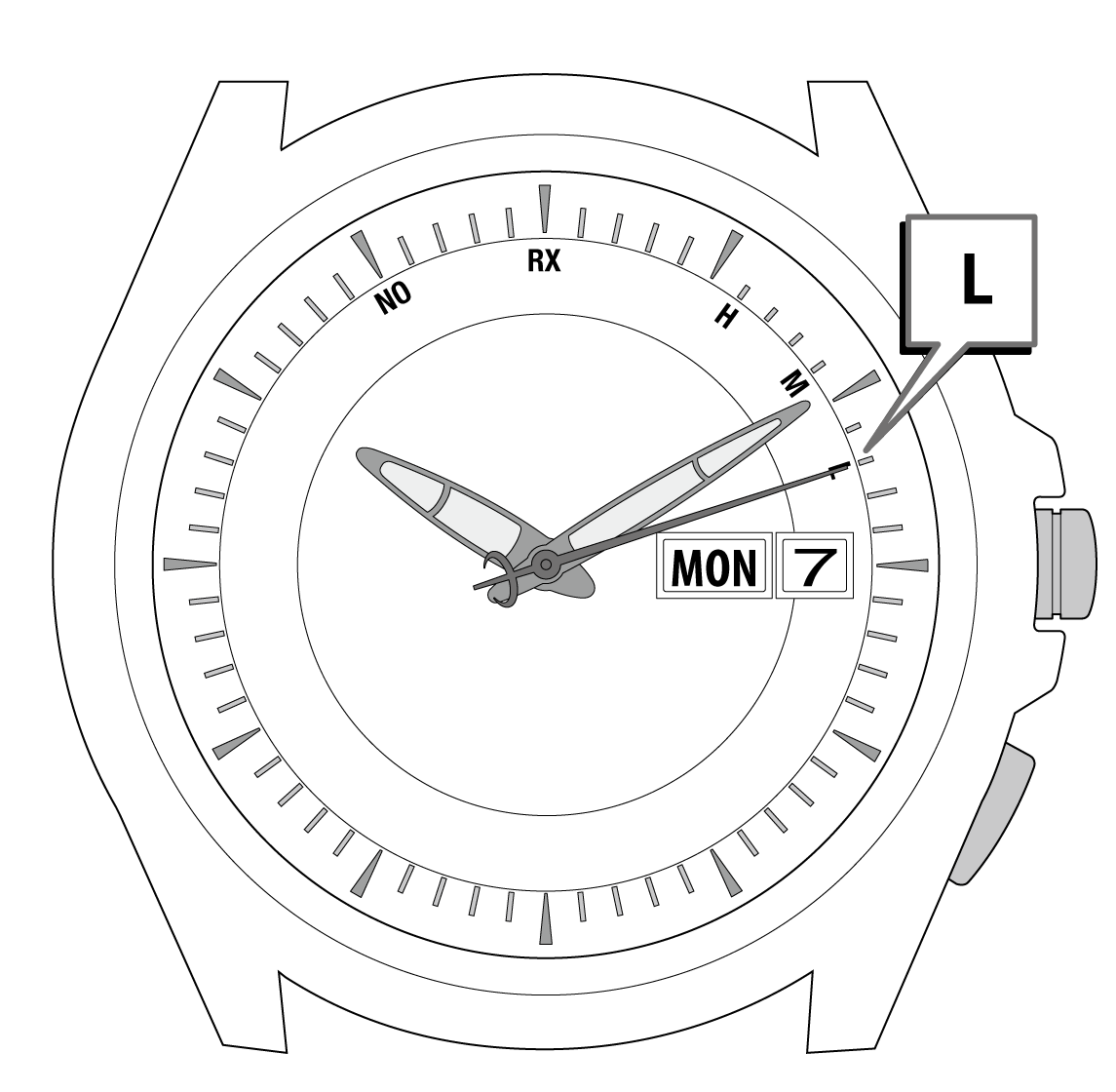 モデルによって、秒針の先ではなく尾で示すタイプもあります。