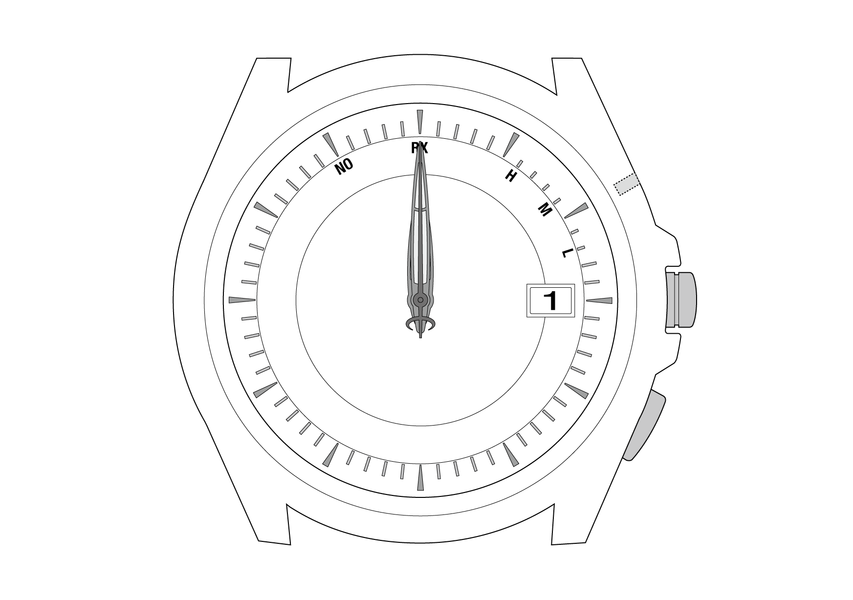 - りゅうずを回して、時針を正しい基準位置に合わせる