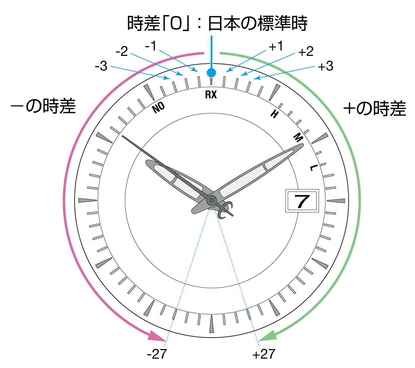 日本の時刻を表示させたいときは、秒針が「0秒」を指すようにします。