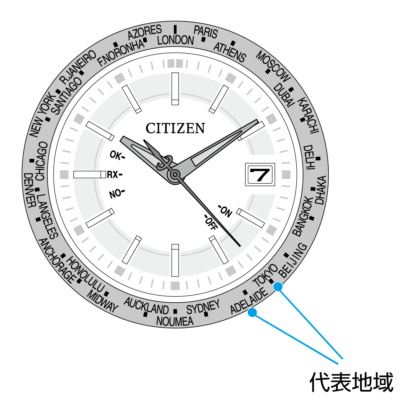 図では、秒針が「TOKYO(東京)」(23秒)を指しています。