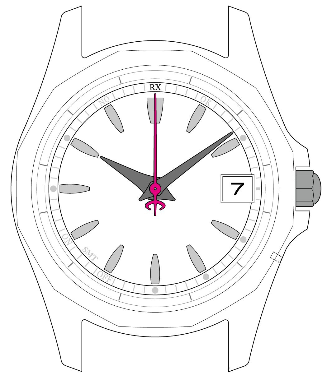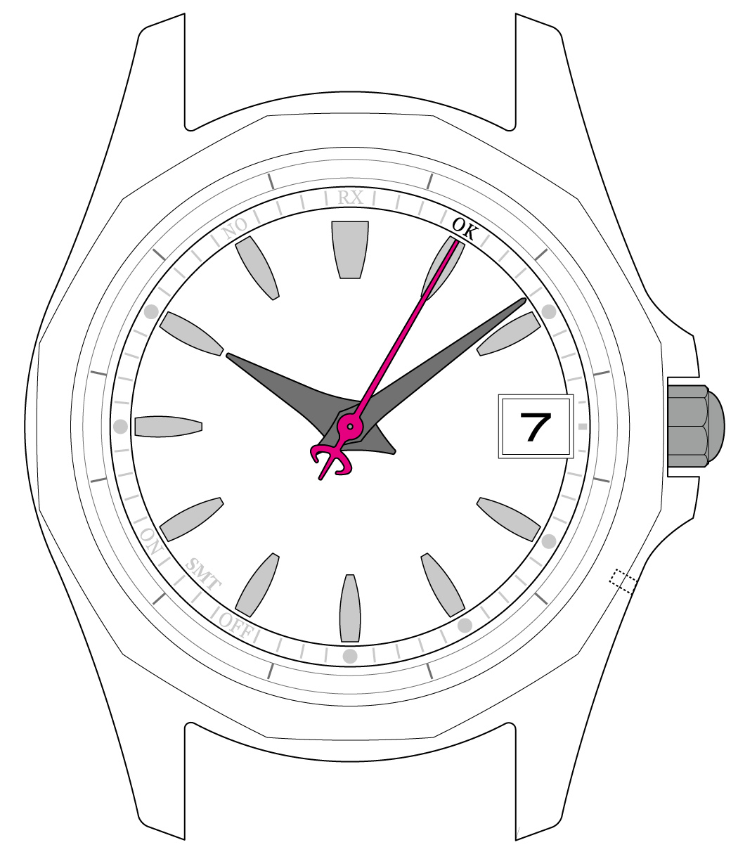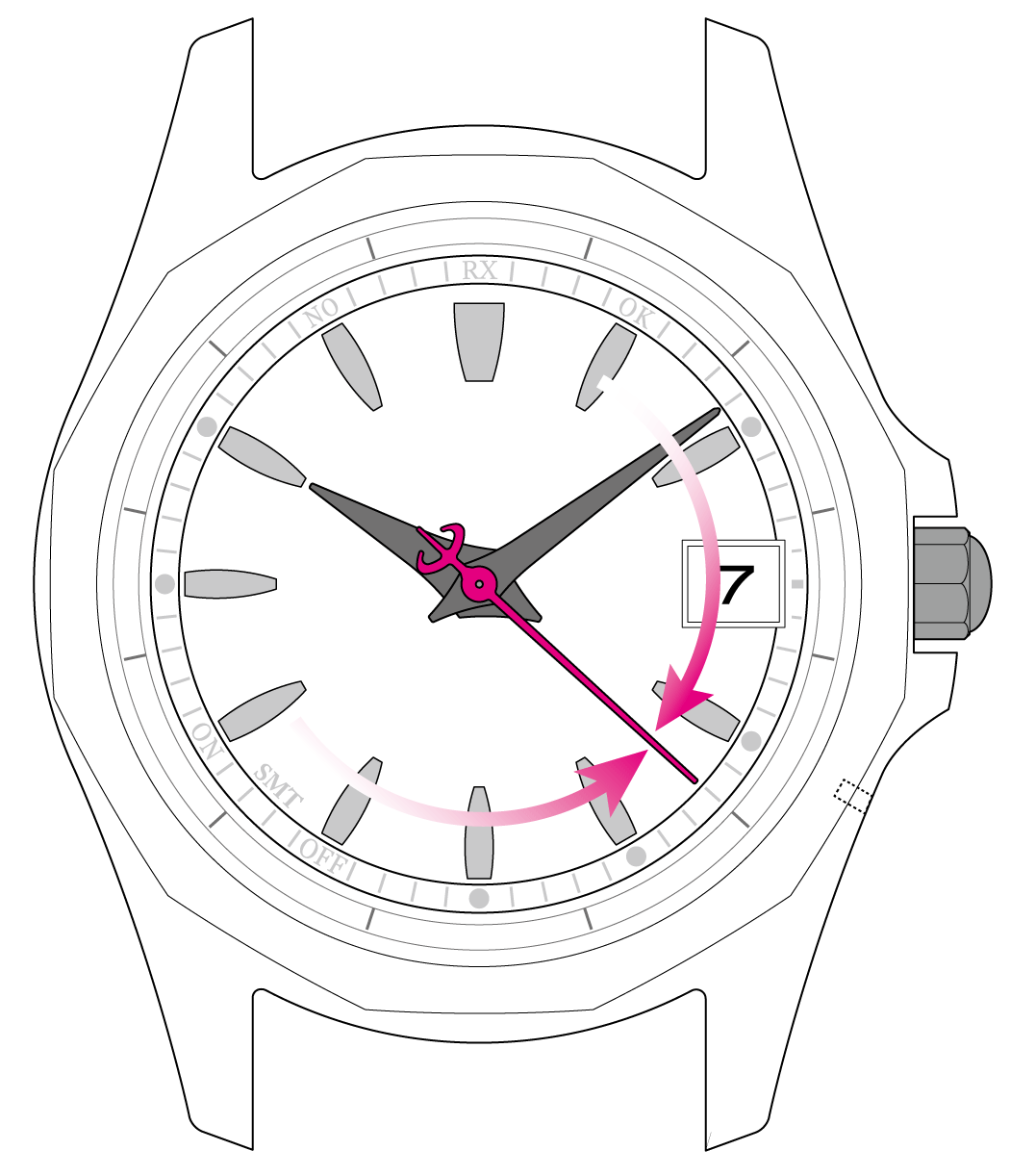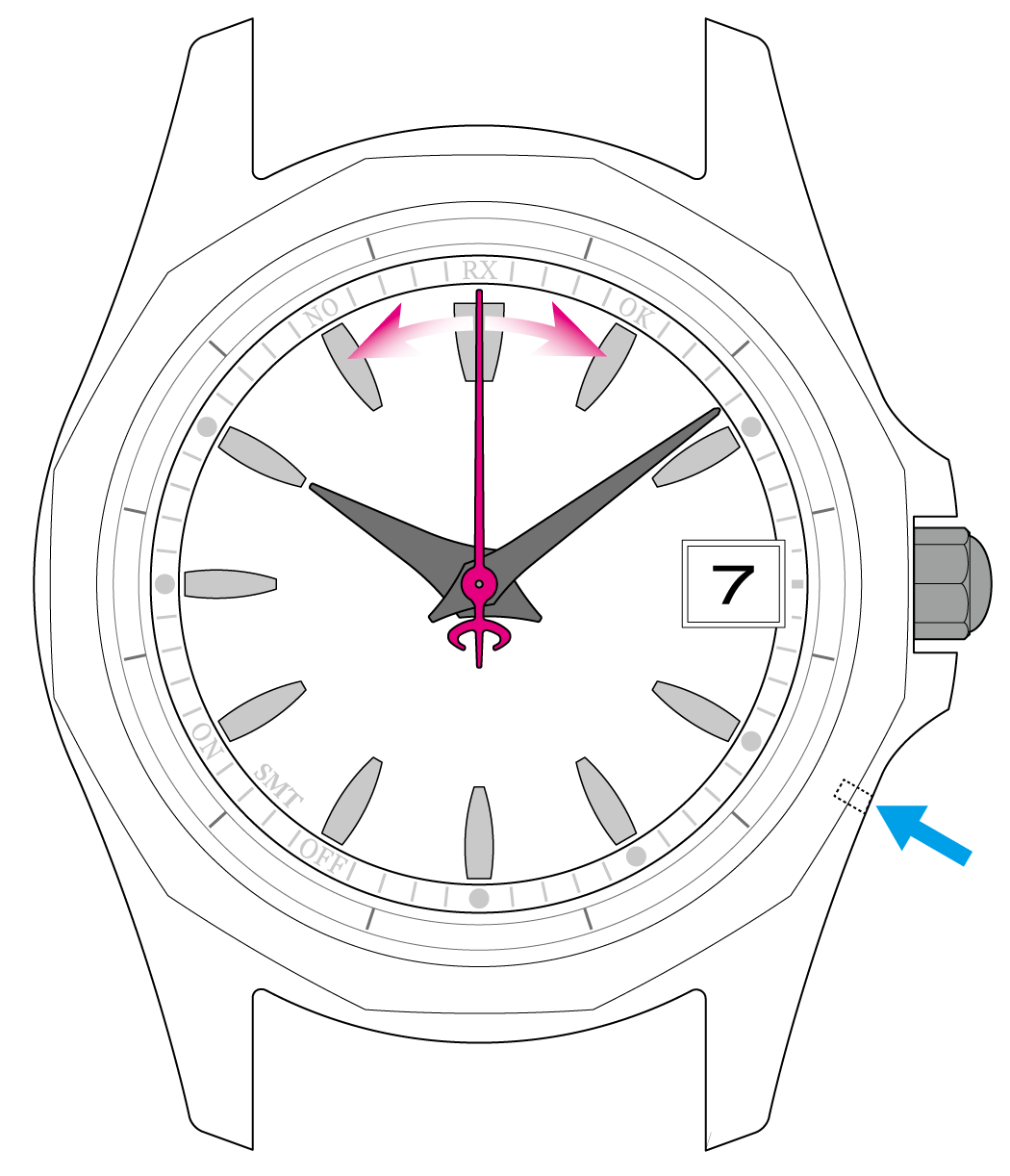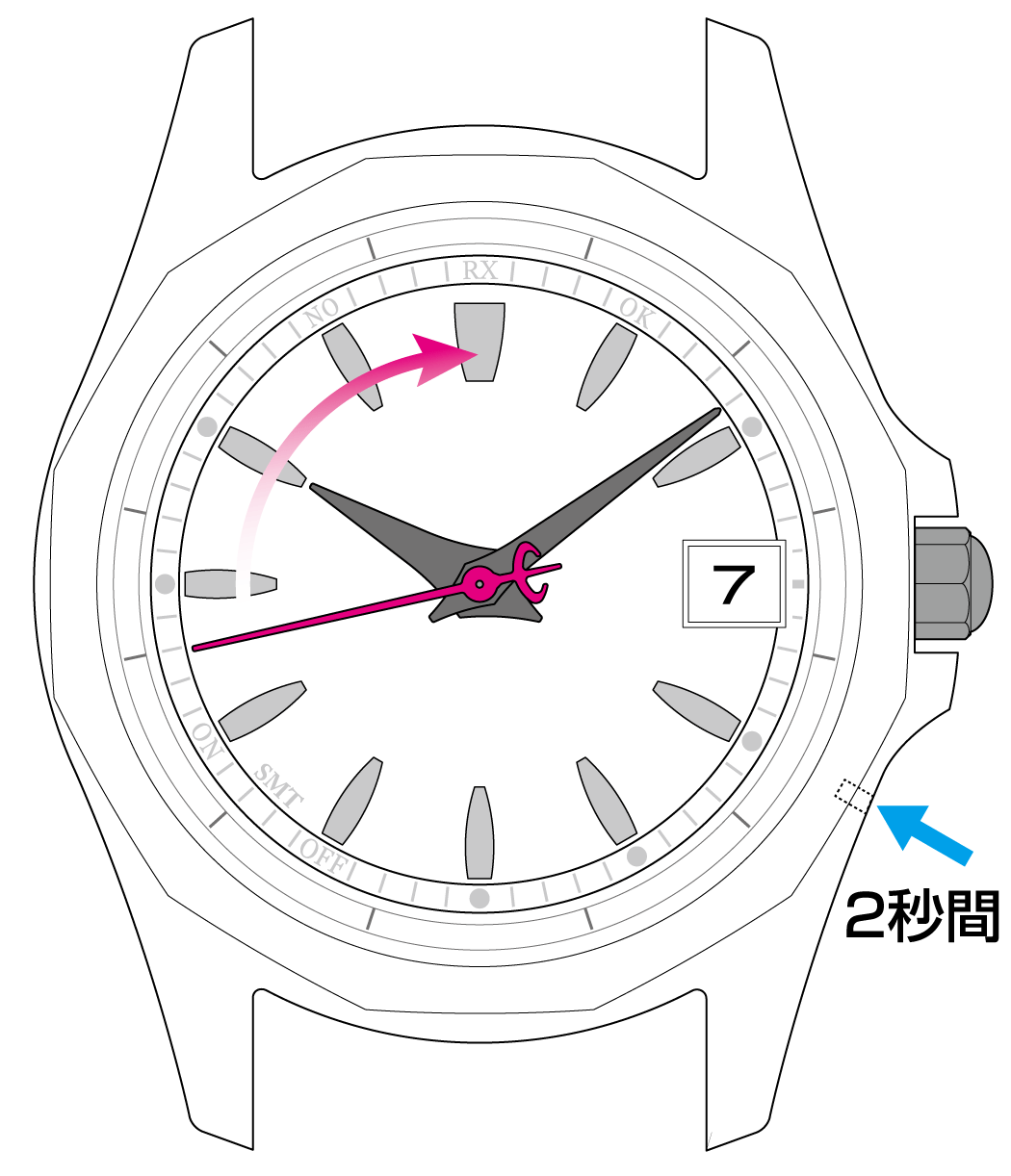 秒針がRXを指して止まったら、 受信が始まります。ボタンを離してください。