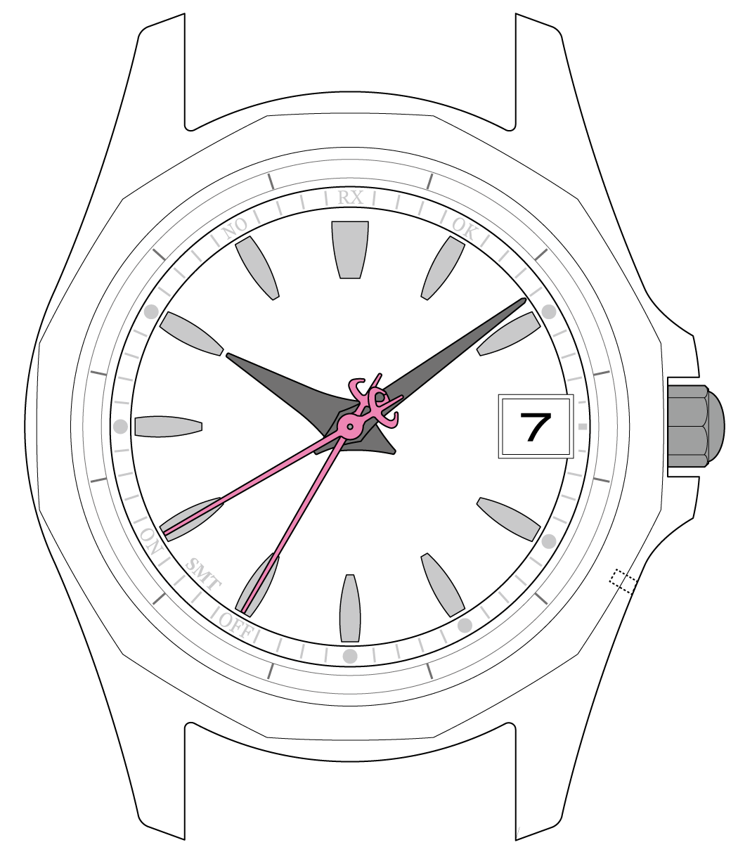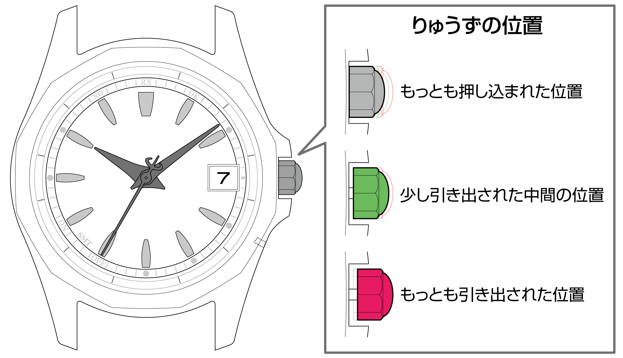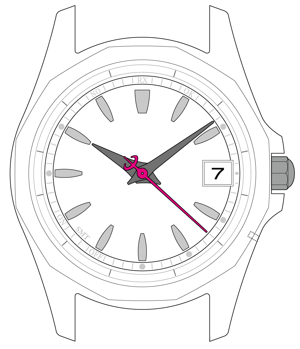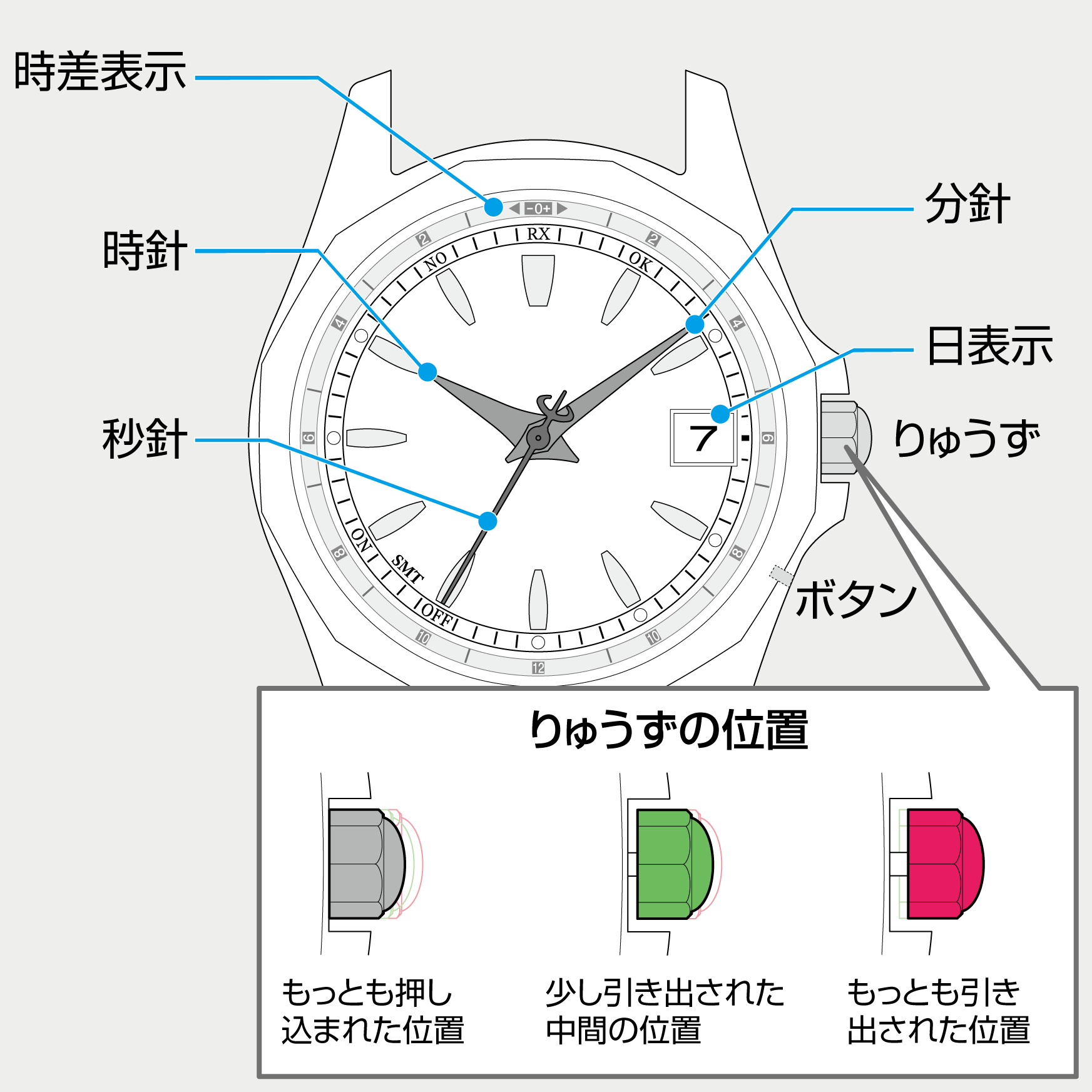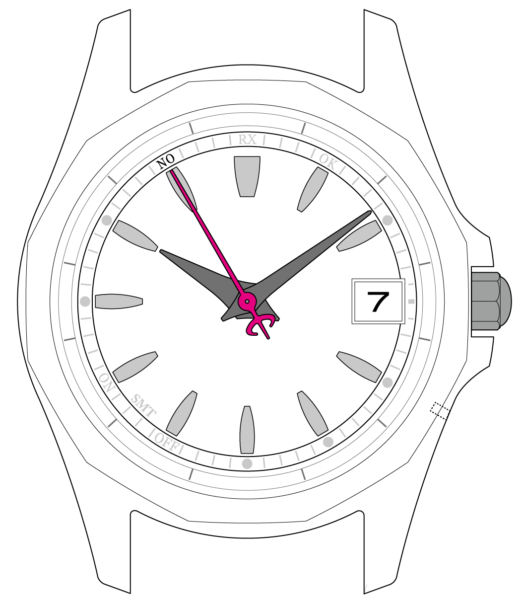 秒針がRXを指して止まったら、 受信が始まります。ボタンを離してください。