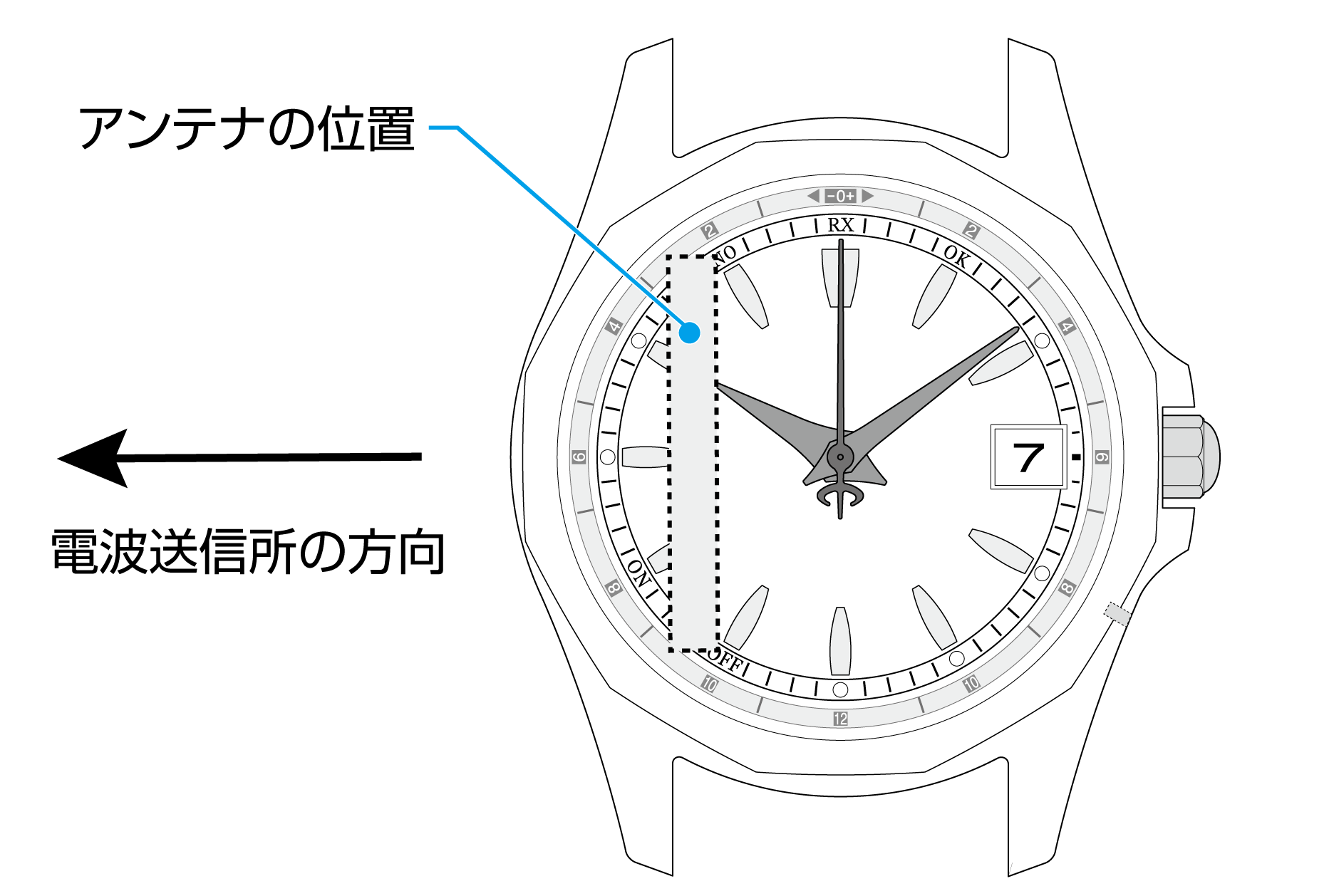 - 電波受信用のアンテナは、この時計の9時位置に組み込まれています。