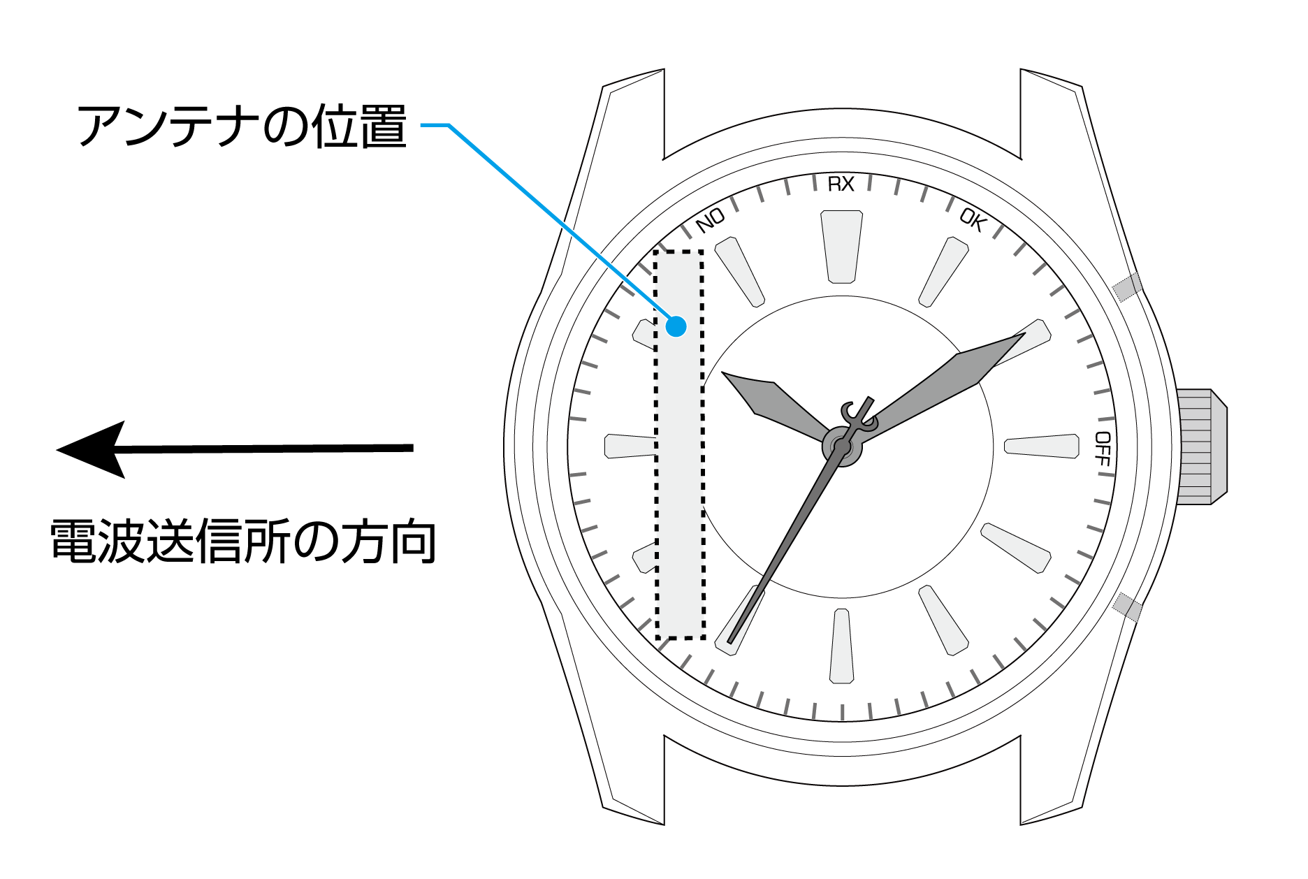 - 電波受信用のアンテナは、この時計の9時位置に組み込まれています。