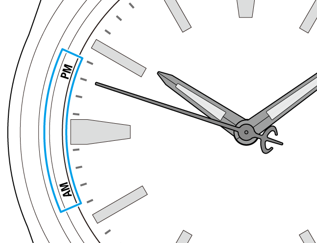 秒針が「AM(午前)」または「PM(午後)」を指します。