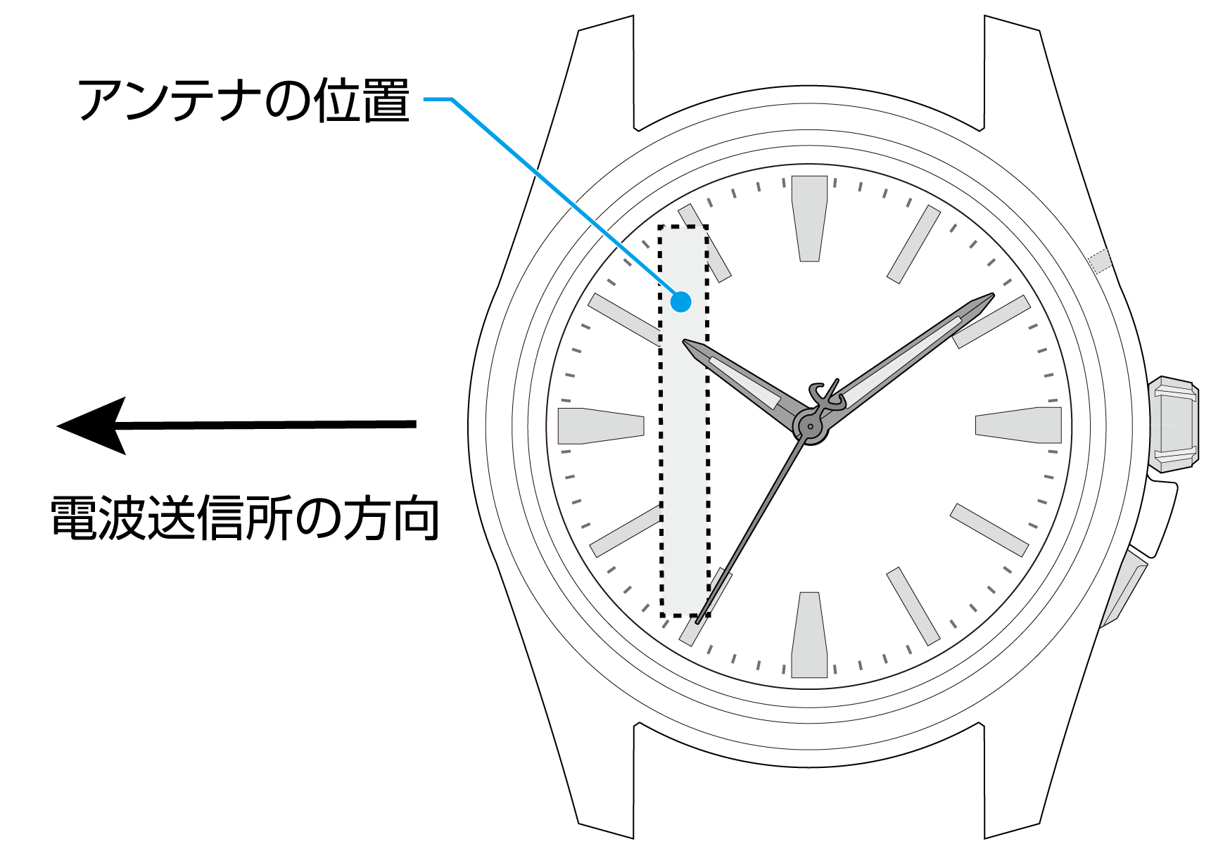 - 電波受信用のアンテナは、この時計の9時位置に組み込まれています。