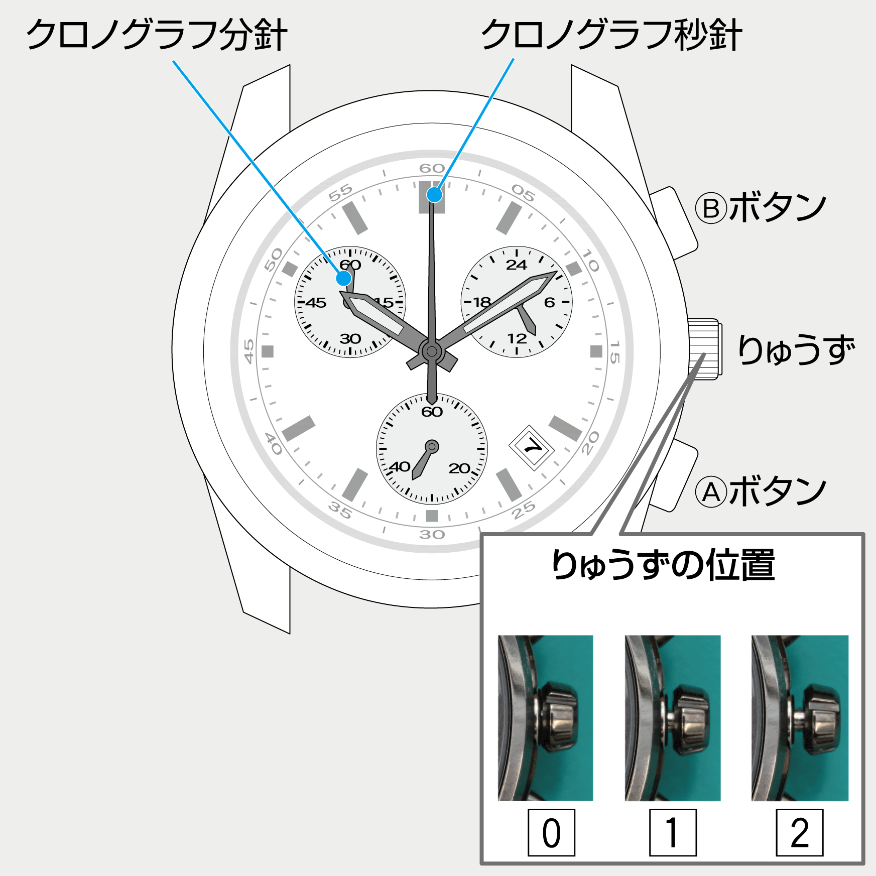 - 右上のBボタンをくり返し押して、クロノグラフ秒針が0秒を指すようにする