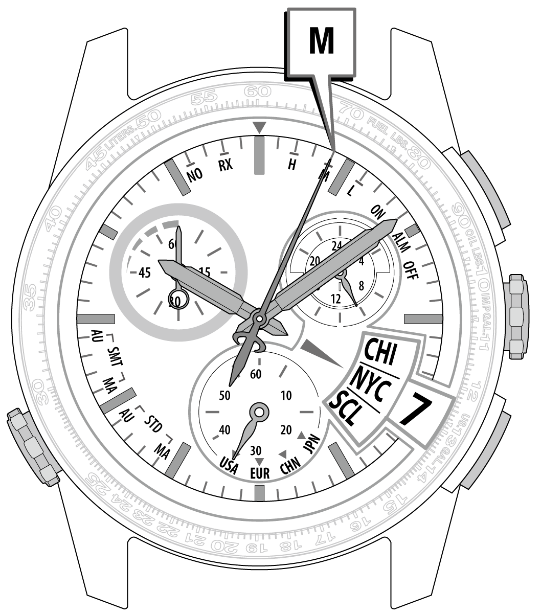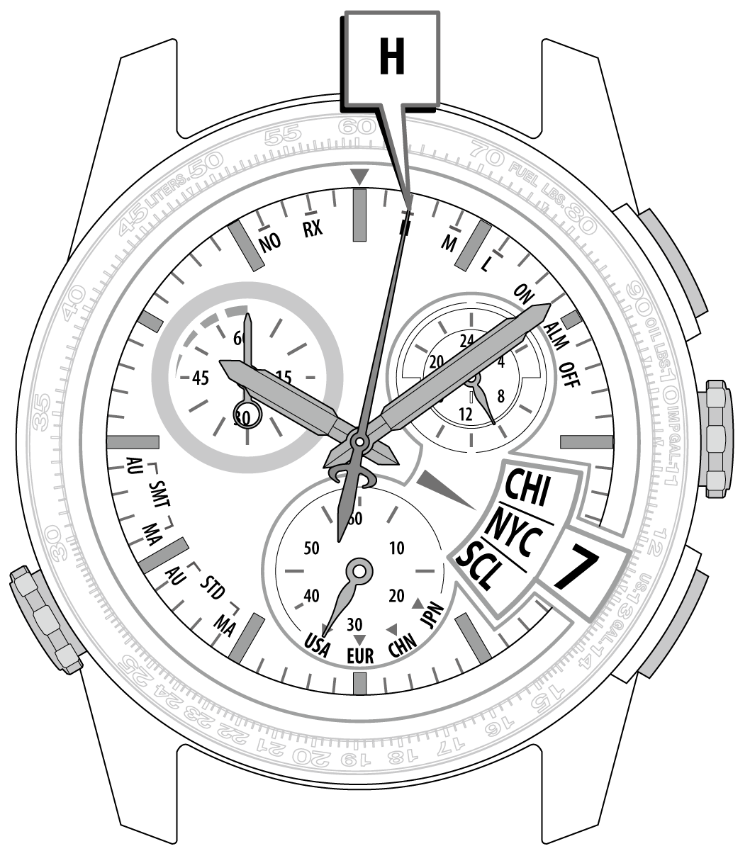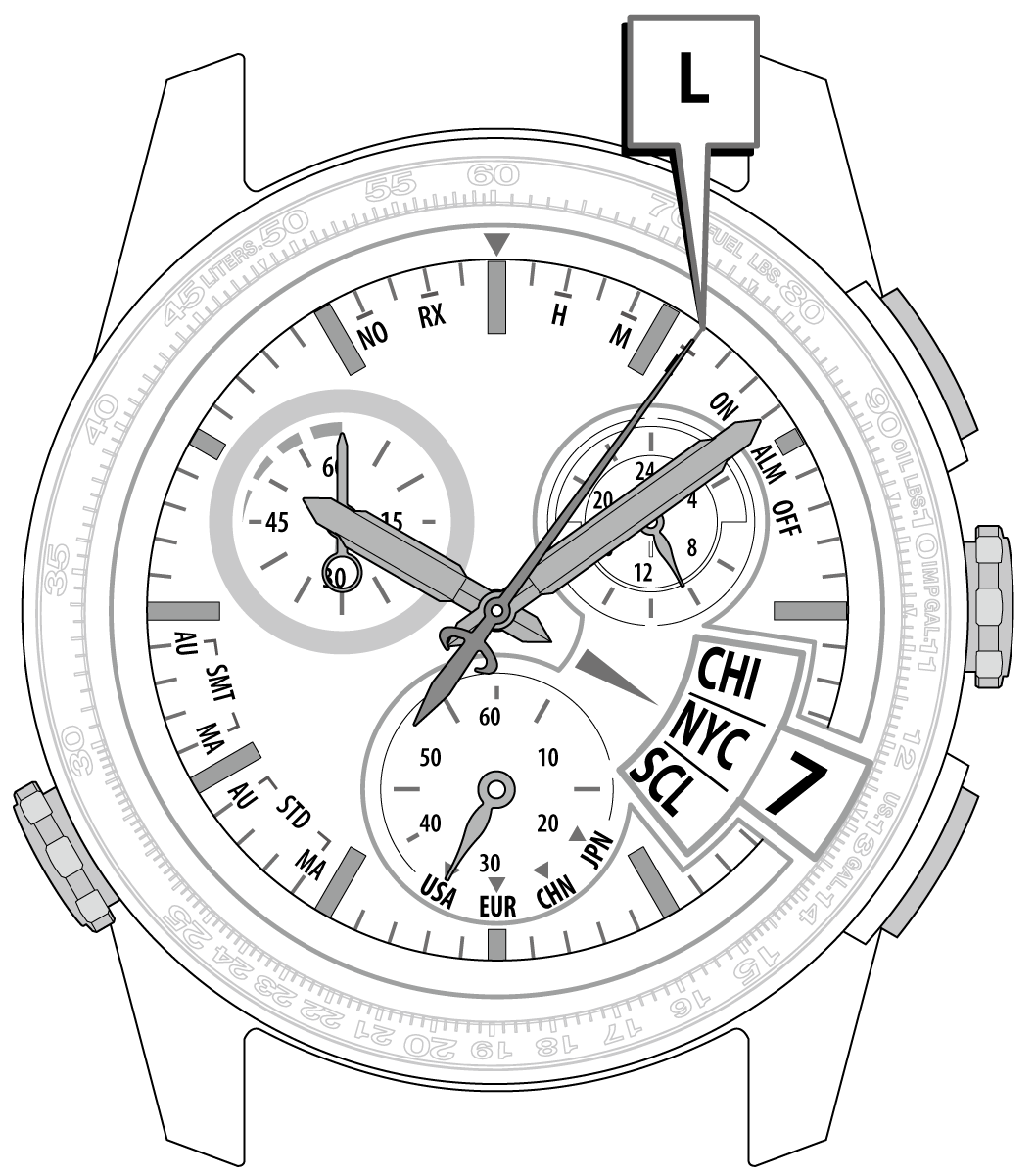 クロノグラフ秒針が「RX」を指している間に、右下のAボタンを2秒間以上押すと、受信が中断され、通常表示に戻ります。