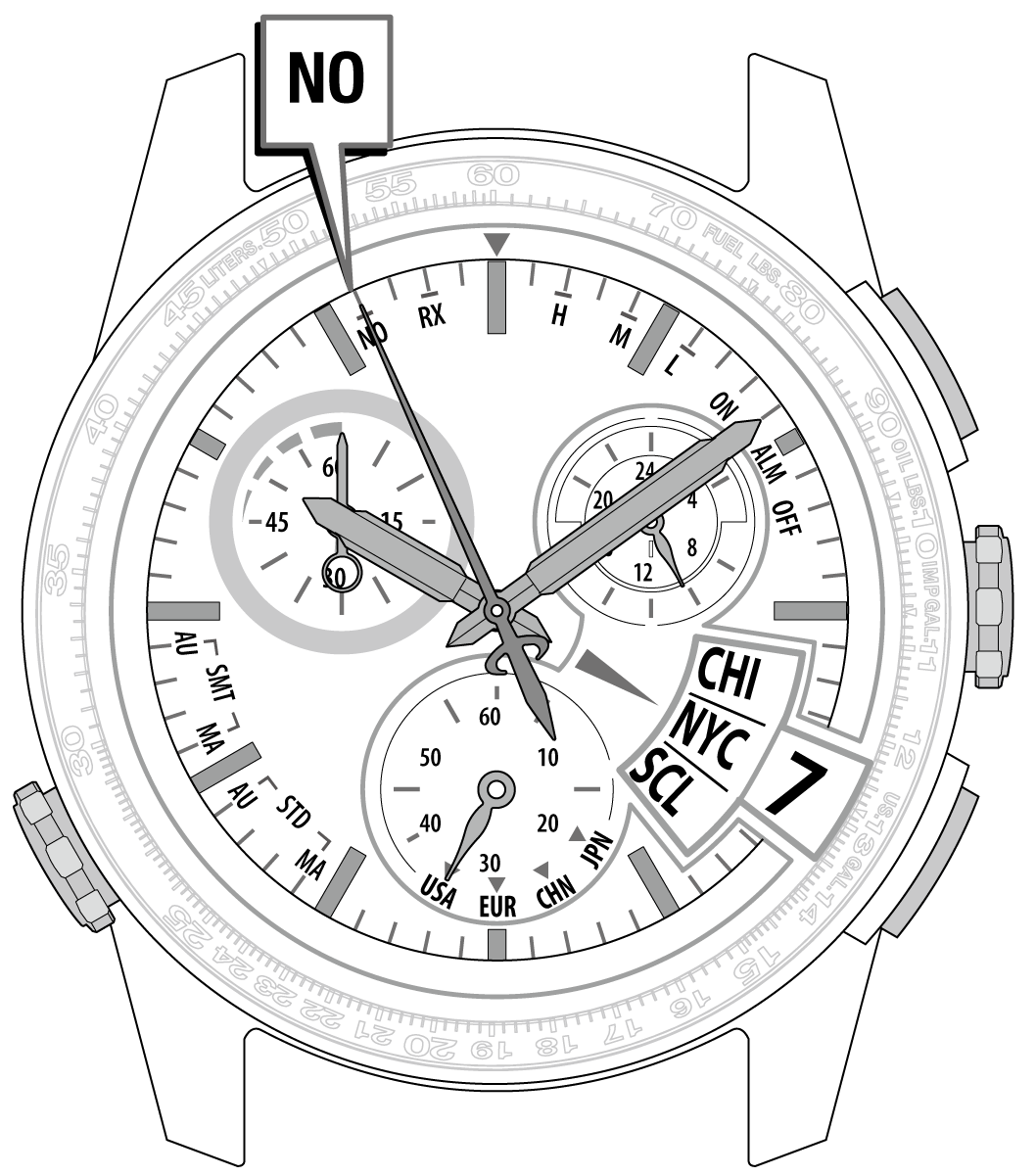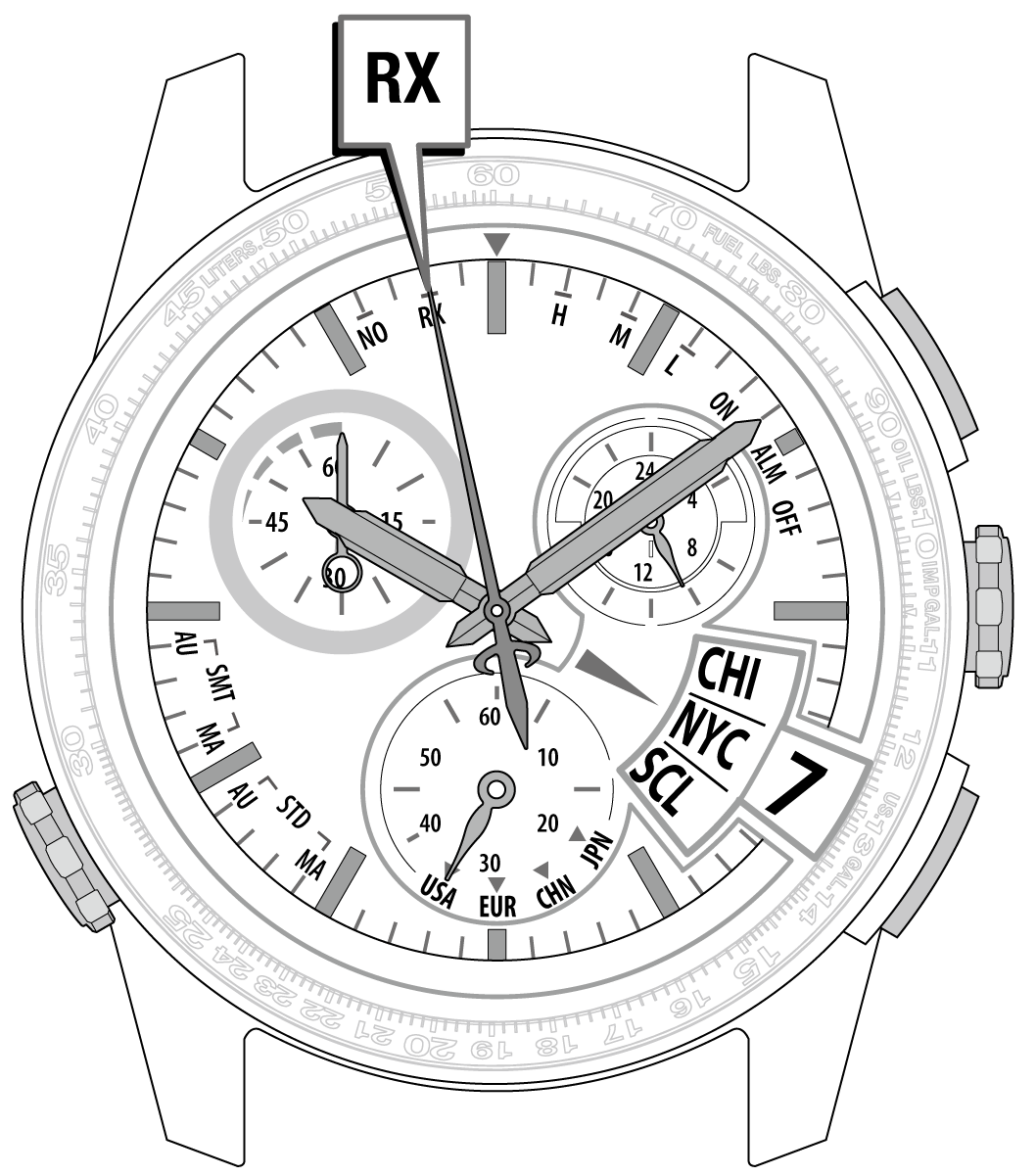 クロノグラフ秒針が「RX」を指している間は、できるだけ時計を動かさないようにします。