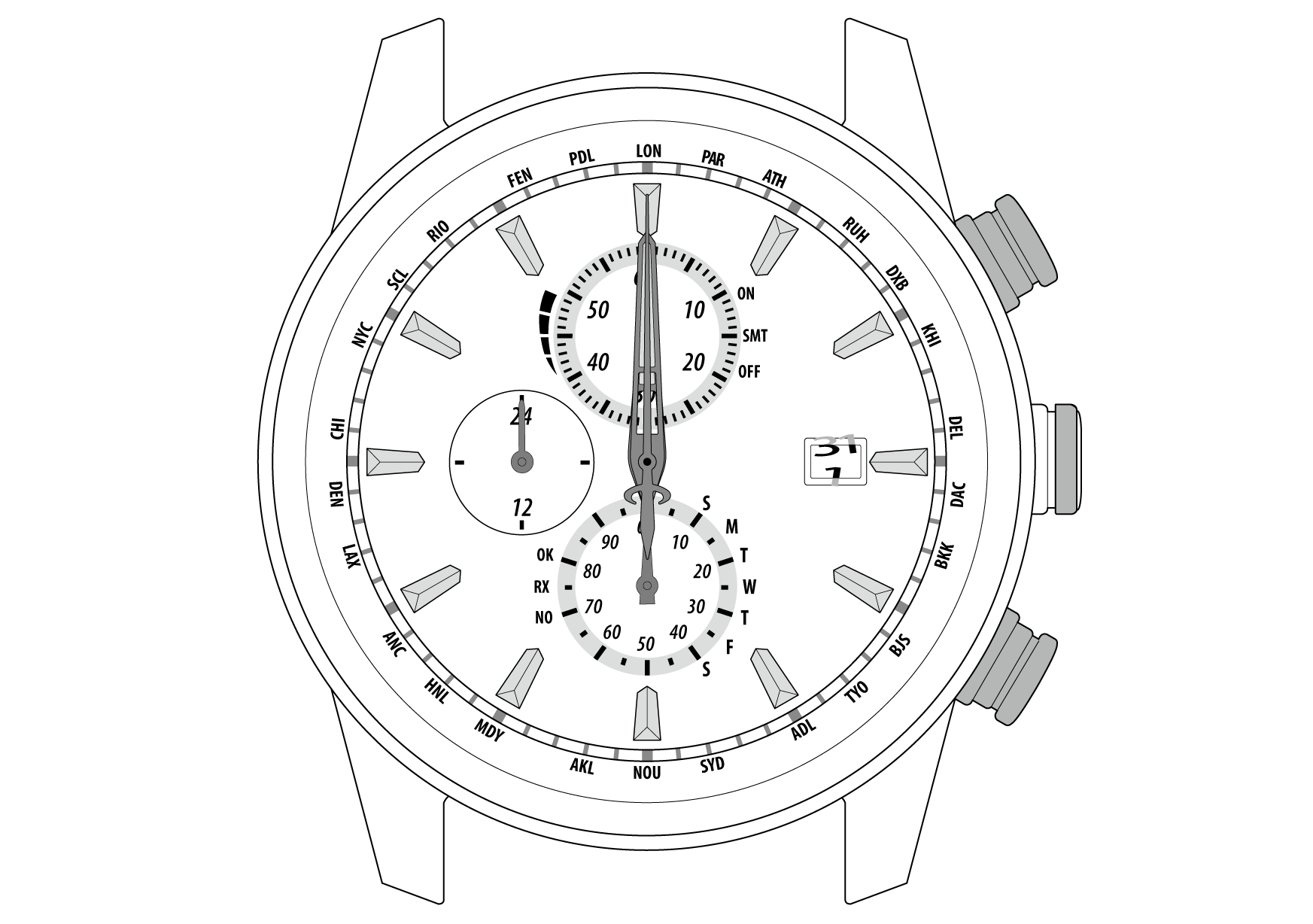 1/20クロノグラフ秒針 → クロノグラフ分針・日表示 → 時針・分針・24時間針 → 秒針 → (はじめに戻る)