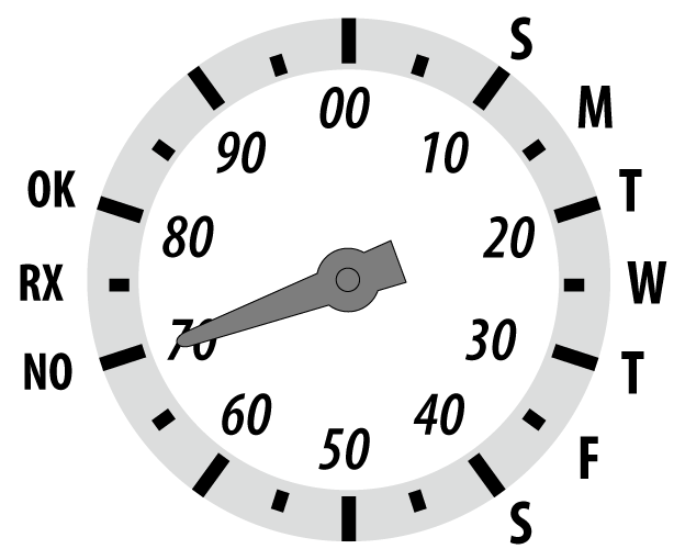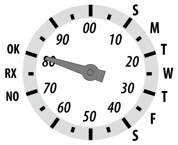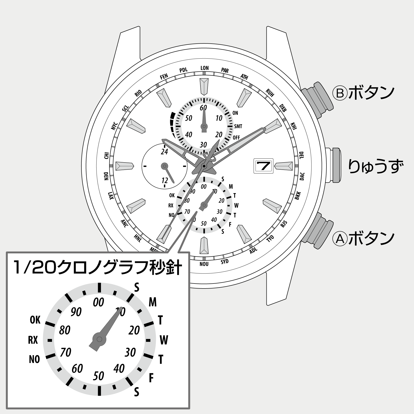 1/20クロノグラフ秒針が、前回の電波受信の結果を指します。